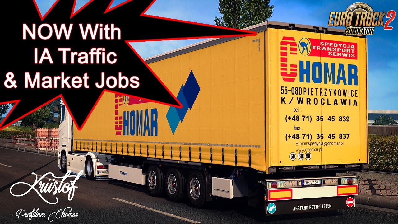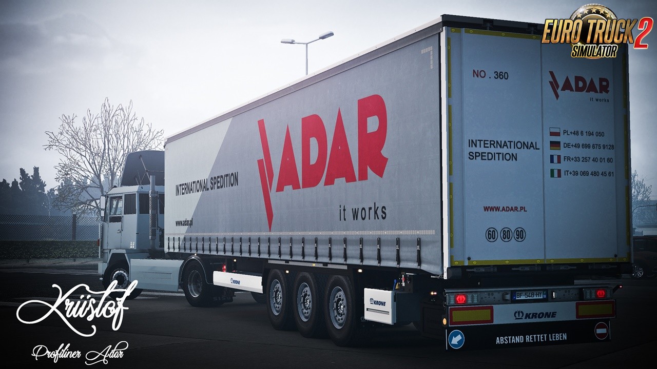 Features Kriistof Pack DLC Krone: 47 Skins to profiliner 37 Skins for coolliner 13 Skins Dryliner IA Traffic Market JOBS high quality skins in futur ... More Market Jobs Changes in v2.0: - new skins added - now with IA Traffic and Market Job If you see another download link it will be Stolen. Respect the Creators who make you enjoy your favorite game. ****47 Skins Profiliner + double**** NADOKO – WILLY BETZ – MOELLER – BGL – BERNARD GIRAUD – BREGER – BRUYER – TRANSEO – BOUDIER – KORNER – PEROCHEAU – CARS&CARGO – GEODIS SNCF – SITRANS – GEODIS – BOURRAT- PORTMANN – BLONDEL – BRING – HARTL – PERRENOT – VOGEL – DELISLE – STB – VUYLSTEKE – ADAR (RED) – ADAR (GRIS) – ADAR (BLACK) – CHOMAR – DETTENDORFER – EWALS – FERCAM – KOIMEX – MGE – SCHOTPOORT – STRABERT – TRANSLOCAUTO – WALLENBORN – TRADE UNION – GILLES TRANSPORTS-KLG TRANSPORTS - DOUMEN - MAUFFREY NEW - SUCEUSES DE L'OUEST - ROUXEL - CALSINA CARRE - SERVETO ****37 Skins Coolliner **** G7 – HERVOUIN – JH MESGUEN – SONCOTRA – MOUSSET – GARTNER – BRING – PREVOTE – EDDIE STOBART – GILBERT DE CLERCQ – FM LOGISTICS – BECKER – MARCHAND – DEMAISON – PELLET MOINE – PREVOST – P.BONNART – PRIMAFRIO – TONOLI – GODFROY (old) – BRAXSTONE – STB – JAMMET – STAF Collection Orange – STAF Collection Noir – STAF ( Green ) – STEF – A.BELZUNCES – AG TRANSPORTEN – COLTRANS – DAILYFRESH – FRERET ET FILS – GOES – KENDY – CAUDETTE – BOEKSTIJN – BLONDEL - FIRST CARGO ****13 Skins Dry liner**** ALDI – E.LECLERC – MARCHAND – AUCHAN – CARREFOUR – VISBEEN – PAPALINO – CAMILLO PALMERA – N.DENTRESANGLE – RHENUS - VIGNERON - DARFEUILLE - TENDRON If you want support me or donation - https://www.paypal.me/Kriistof Tested on game version 1.35.x, 1.36.x Credits: Kriistof, Mdmodding |