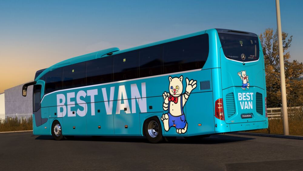 Best Van Turkuaz skin for the Heavy Vehicles Turkey Mercedes-Benz New Travego 16 SHD mod is with you. It appears in Custom Template 1. Put the mod on top of the car mod for the mod to work