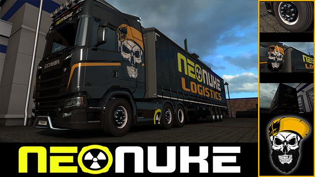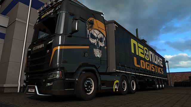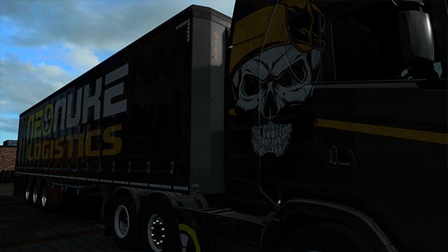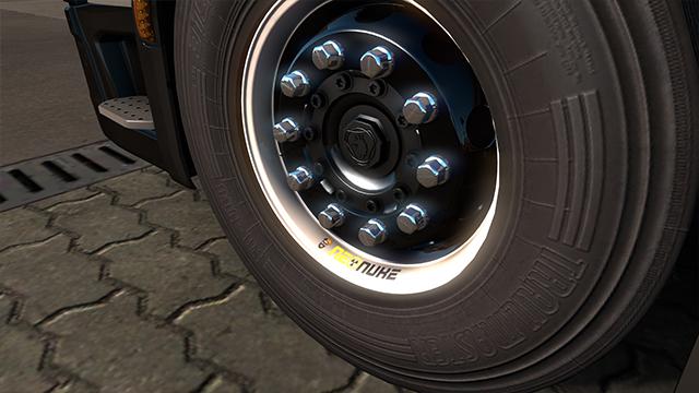 It has a metallic changable skin on the trailer (SCS Curtain) and it also comes with its own painted wheels.