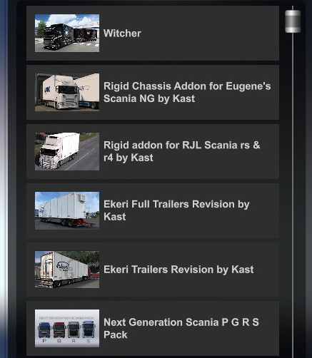 Trucks supported: – Scania R Next Generation by Eugene – Scania S Next Generation by Eugene Addons supported: – Next Generation Scania P G R S Series – Rigid Chassis Addon for Eugene Scania NG by kast – RJL Scania tandem addon by kast – Rigid chassis addon for RJL Scania RS, R4 & G by Kast – Ekeri Full Trailers Revision by Kast – Ekeri Trailers Revision by Kast Is this skin for the new version of Ekeri by Kast Credits: Alik Credits: Alik |