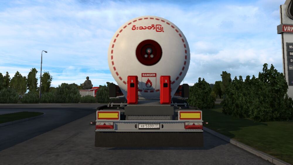 This mod is trailer skin for SCS Gas Tank Trailer. For 3 axles. The sentence on tank means flammable as Myanmar Language. Credits: Player Thurein |