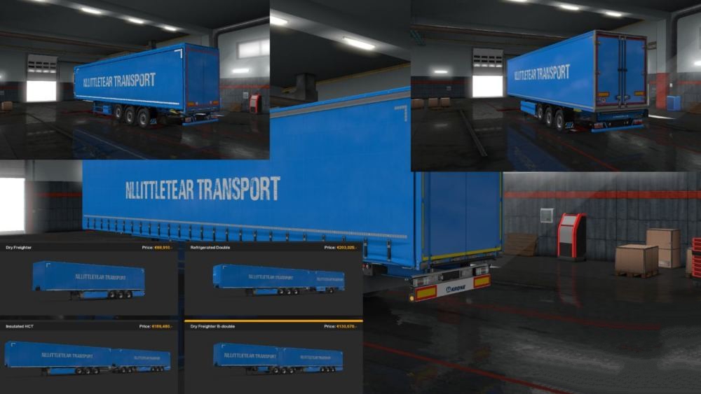 You can use this kit to create your own skin for your own trailer that you can drive with. V1: Release V2: Skin shows up in game V3: Sideskirts etc can be painted V4: 1) Easier to skin. Only 2 templates. 2) Fixed skin on Curtainsider doubles V5: Added support for Krone DLC V6: Coolers can have a color now (Not Krone DLC yet) V7: Fixed some bugs V8: Added support for Schwarzmüller DLC Supported game version: – 1.35 Credits: NLLittleTear |