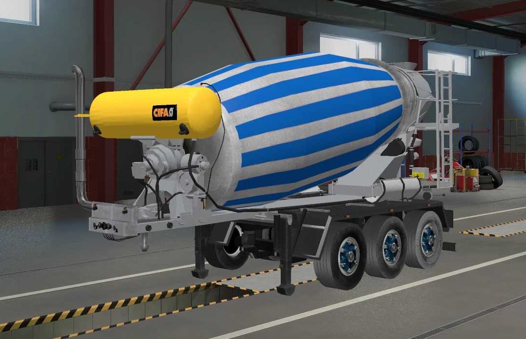This is a concrete mixer trailer that can be transported with all ETS 2 trucks and can be purchased at trailer dealers. The trailer has three axles and the concrete mixer turns out to be rotating! In fact it is equipped with animation. The animation is active whether the truck is off or the engine is running. It has five different colors of the rotating part of the mixer that can be selected when configuring the trailer at the trailer dealership. Even the frame of the concrete mixer has several preset colors and you have the option to choose a custom color. It is also possible to change the tires and rims. To install copy the file in the mod folder and activate in the profile. You will find the new trailer in the configurator of owned trailers, under CIFA section In case you wish to remove the mod, it is best to first sell all the trailers belonging to it. Successfully tested on version 1.47 Credits Antonio62, Peppe75 Tester: Baltazar Credits: Antonio62, Peppe75 Tester: Baltazar |