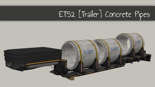 Name: ETS2 [Trailer] Concrete Pipes (NP4) Truck: All Game: Euro Truck Simulator 2 Game Version: 1.41 * or above !!! mod is not tested for problems with game ver. 1.39.* and 1.40.* Author: SASq Info about ETS2 [Trailer] Concrete Pipes (NP4): Two cargo versions clear and dirty. Mass of all: 28680kg (almost 29t) Mass: 9560kg Diameter: 2.4m (radius 1.2m) Long: 2.5m What mean NP4? Non Pressure pipe with wall thickness 4 NOTE1: Maybe you need to rest several times before you can see the "Concrete Pipes (NP4)" in jobs list. NOTE2: You can find the trailer in game trailers reviews: section: "Semi Lowloader with Drop Deck" - for game version under 1.39.* section: "Low Loader Extendable Trailer" cargo: "Concrete Pipes (NP4)" cargo: "Concrete Pipes (NP4) Dirty" Cargo is standalone. Normal cargo jobs. If you have any question, please dont be scared to ask :) If you have any problems with the mod, please report it. Credits: SASq |