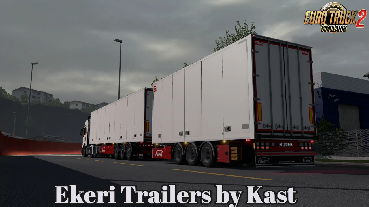 Ekeri trailers - there is selection of variants in freight market: standard, steeraxle, citytrailer, huckepack, tail-lift, cooler, different lights, doubles, different side covers, real company skins. Ownable trailers has been added with many variants, standard 4m and 4,4m seitrailers, stepframe, citytrailer, doubles. Pluss all kinds of customisable options. NB! 19.5rims may be a bitt hassle for now. Maybe in the future there is option to categorise the wheels or sometingh just make sure proper wheels are used on right trailers. Features Ekeri Trailers: - 19 variants of autonomous Ekeri trailers; - Coolers Lumikko, Carrier; - Skins of real companies; - Double trailers; - Own wheels; - Advanced hitch; - Support animation; - Lifting axles; - Trailer cables; - detailed models. Changes in v2.2.2: - Adapted to the latest game patch 1.42; - Missing textures fixed. Pack includes: -19 variants of the Ekeri trailers -Lumikko, Carrier coolers -Real company skins -Double trailers -own wheels -Standalone -Advanced coupling -Trailer lift axle -Company paintjob system -Animated braces -Trailer cables -Ownable trailers -Trailer in traffic Tested on game version 1.42.x Credits: Kast |