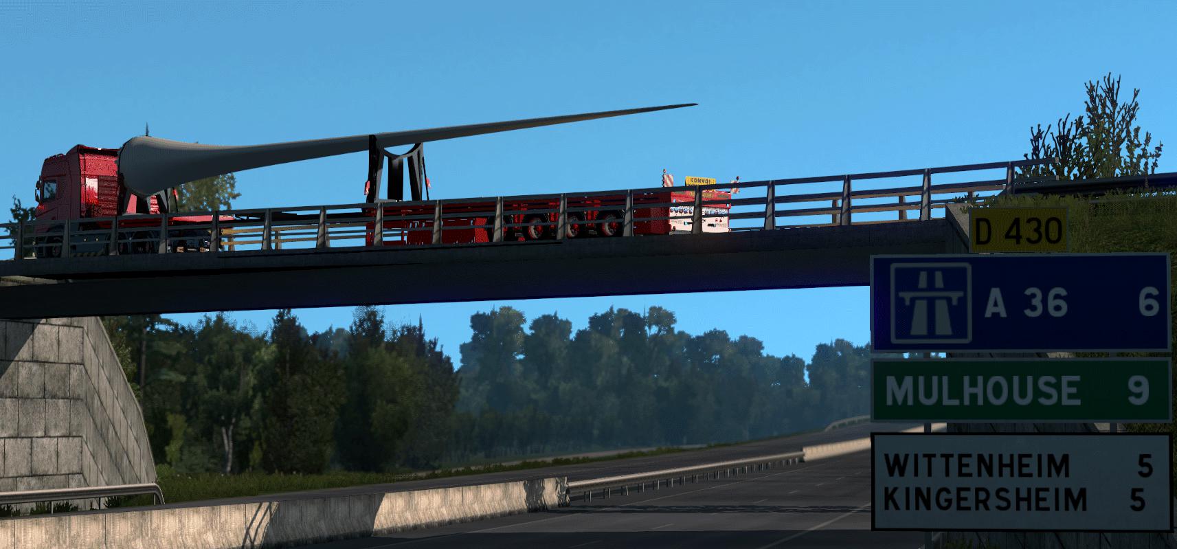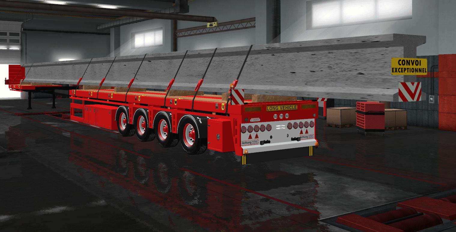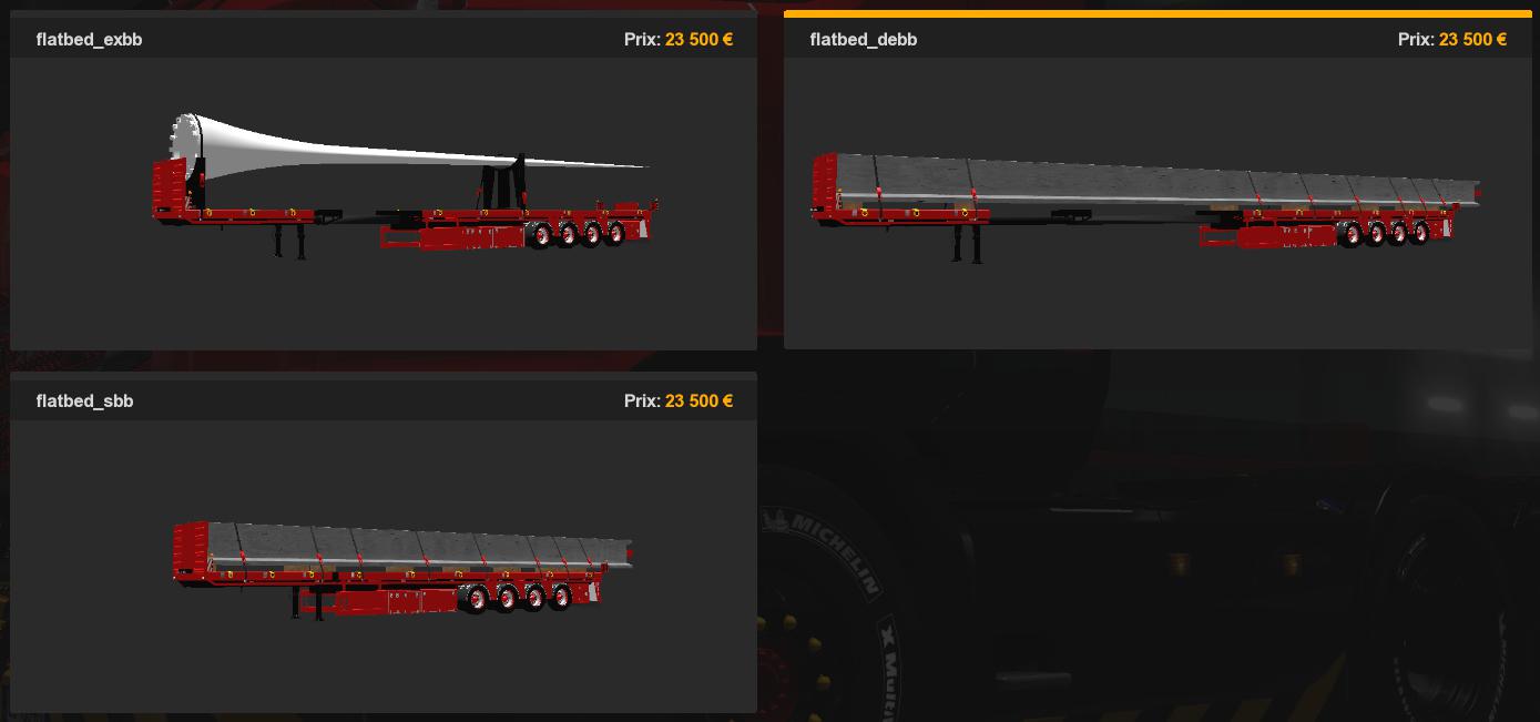 Presentation of the mod: 3 Flatbed trailer: - Single trailer (17m) - Extendable trailer (20m) - Double extendable trailer (25m) Loading: - 3 blades of wind turbines (18m/20m/25m) - 3 beams (19m/23m/28m) Bumper Ar: - Round lights (5 per dimension) - Slots of lights (10 per dimension) Credits: BBModdings |