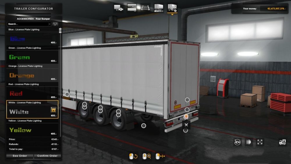 Ownable Trailer License Plate Lighting Game Version – 1.33 Version 1.0 – First Release Features – 6 Slot for Standart & Exclusive RearBumper – 2 Slot for Lift Gate RearBumper – Colorful Lights for Slots (White, Blue, Green, Orange, Yellow, Red) – Support SCS Base Ownable Trailers Credits: SCS SoftWare, MehdiAnti Credits: MehdiAnti |