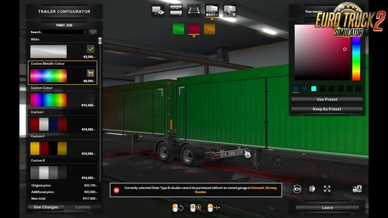 Metallic paint for own trailers. Only for version 1.32! Credits: John, SCS Credits: John, SCS |