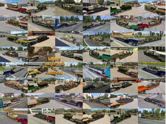 Pack adds in game 217 military cargo. New cargo added to 74 companies for Default Map, all official DLC’s, Rus Map, EAA Map. All standalone. Works on any map. For version 1.45.x Compatible with all my packs. Included english and russian versions. For english version you must have in mod folder two files: military_cargo_pack_by_Jazzycat_v6.0_base.scs military_cargo_pack_by_Jazzycat_v6.0_eng.scs If you’re a military maniac you can put in mod folder traffic file military_cargo_pack_by_Jazzycat_traffic.scs Version 6.0 – added new military cargo MRAP Cougar Credits: JC |