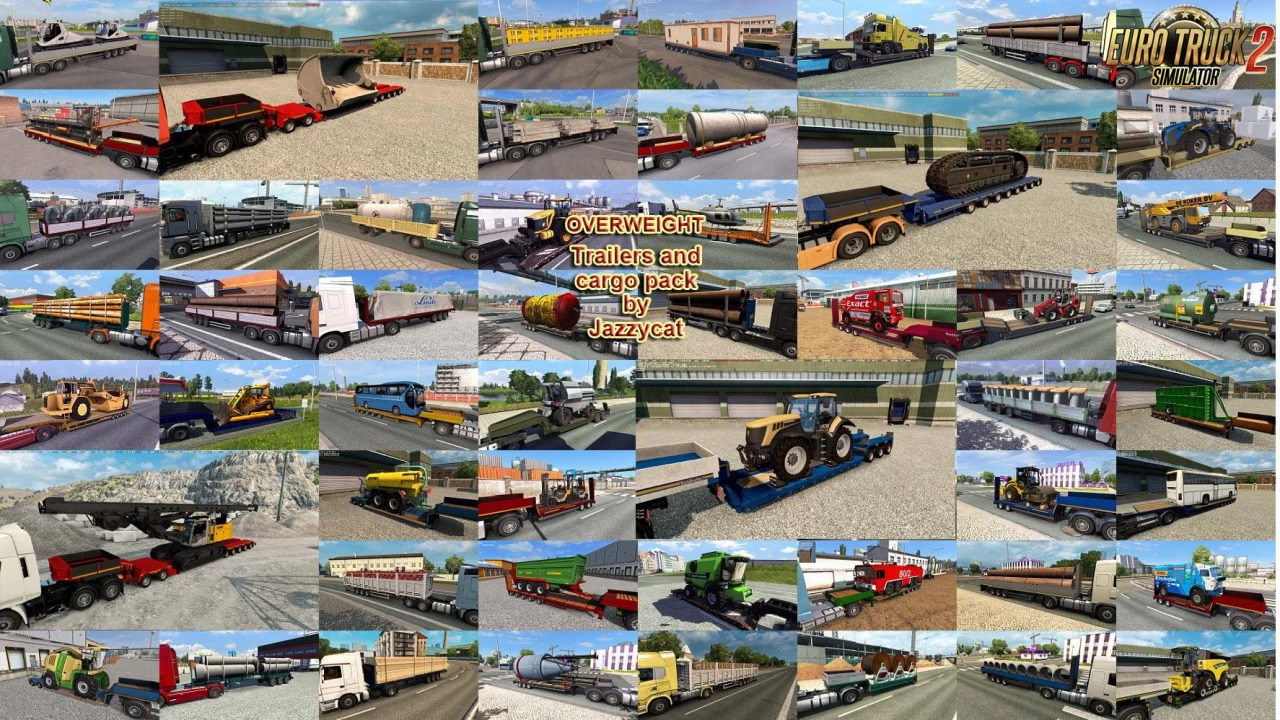 Pack adds in game 53 new models of overweight and flatbed trailers (different trailers by Fliegl, Wielton, Kassbohrer, Krone, Goldhofer, Nooteboom, HRD, Estepe, Langendorf, Galtrailer, Chmzap, Maz, Nefaz and others), 341 new cargo, 110 traffic trailers. New cargo added to companies for all popular maps. All standalone. Works on any maps. For version 1.41.x Compatible with all my packs, except trailers and cargo pack. Included english and russian versions. For english version you must have in mod folder two files: overweight_trailers_and_cargo_pack_by_Jazzycat_v9.9_base.scs overweight_trailers_and_cargo_pack_by_Jazzycat_v9.9_eng.scs If you want overweight trailers in traffic put in mod folder file: overweight_trailers_and_cargo_pack_by_Jazzycat_v9.9_traf.scs Attention! This pack is part of my Trailers and cargo pack. Don’t use them together! Version 9.9 – added different new cargo for flatbed trailers Credits: JC |