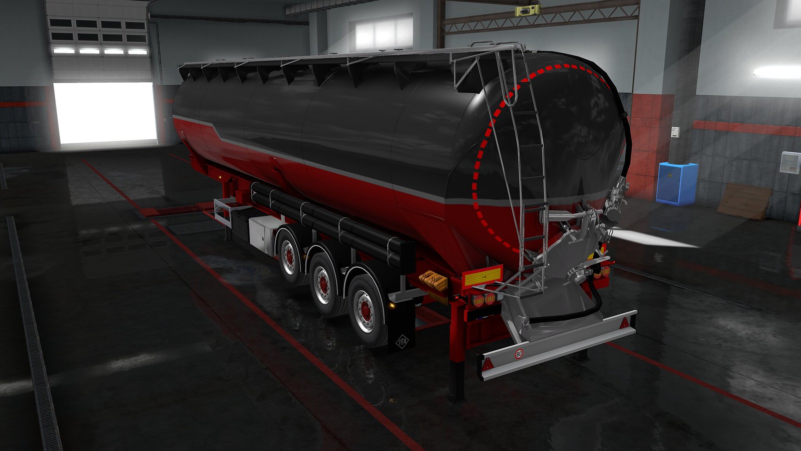 - A set of realistic models of Feldbinder KIP silo trailers built after 2010 - More accessories in standard and painted variants - Long/short models - 63m³ and 42m³ bodies included in the first (re-)release - SCS standard paintjobs, now including 'Duellist', 'Canopy', 'Sunrise', 'Sade' and 'Crystal Ray' - compatibility with SCS accessories (wheels, mudflaps) - Reflective stripes side and rear in 3 colors - Paintable mudflap with own template - Painted and steel side protections, painted variants with own template, a variety of variants with different storage boxes and/or slots for boxes - Painted and steel rear bumper in 'standard', 'luxury' and 'custom' flavors, painted variants with own template - Custom rear bumper partially compatibie with other accessory packs like the SCS Trailer Tuning Pack German Companies Skinpack includes: - Franz Fischer (63m³ - New Actros) - Freund (63m³ - DAF 105, DAF Euro6, New Actros) - Hegelmann (63m³ - MAN TGX Euro6, New Actros) - Kleinwächter (63m³ - New Actros, Renault T, Volvo 2012) - Kobernuss (63m³, 42m³ - New Actros Streamspace) - Nijmeijer Transport Logistik (63m³ with custom mudflap - DAF Euro6, New Scania S, Volvo 2012) - Reinert (63m³, 42m³ - MAN TGX Euro6) - Schmidt Heilbronn (63m³ - New Actros, New Scania R) - Seifert (63m³, 42m³ - New Actros) - Sievert Handel Transporte (63m³, 42m³ - MAN TGX Euro6, New Scania R) - Steinkühler (63m³ - MAN TGX Euro6, New Scania R) Credits: LadenSwallow |