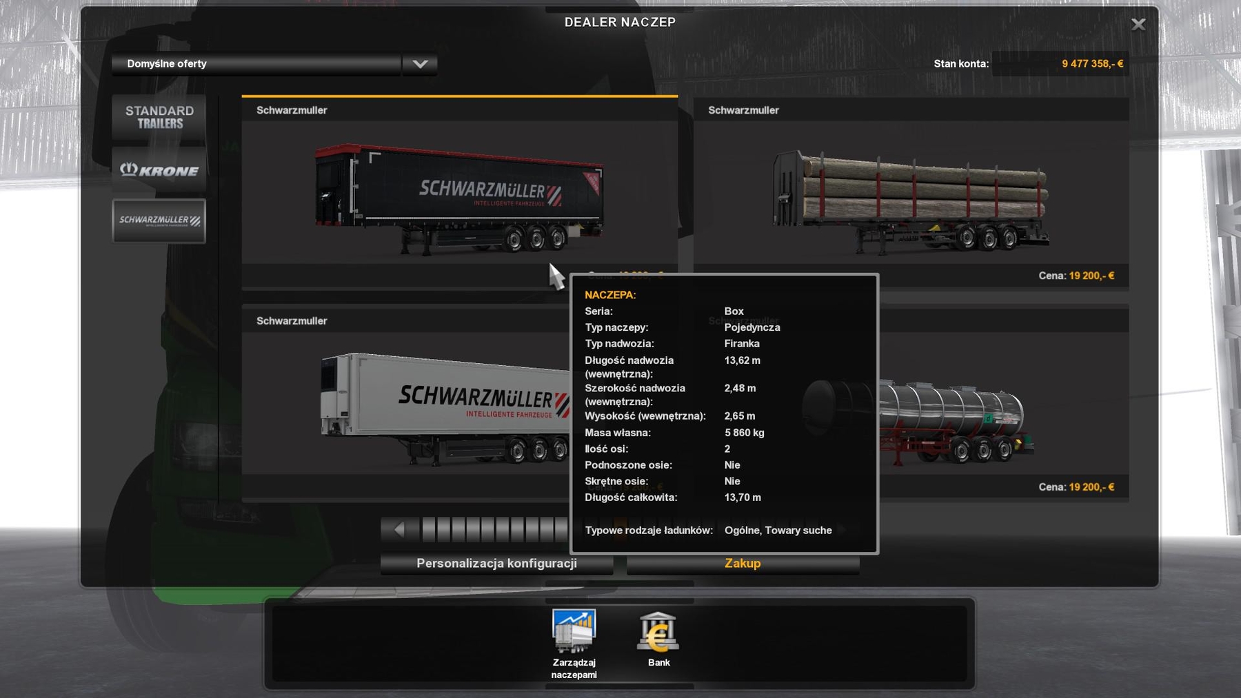 This mod allows you to have your own Schwarzmüller trailer without editing save on TruckersMP. This mod support: Food Cistern Curtain Sider Refrigerated Trailer Slidepost Logging Trailer How to use this mod: 1. Activate this mod on singleplayer. 2. Buy own trailer in the trailer dealer. 3. Enjoy owner Schwarzmüller Trailer on singleplayer and multiplayer (TruckersMP) Credits: Rosyjski Elektryk Credits: Rosyjski Elektryk |