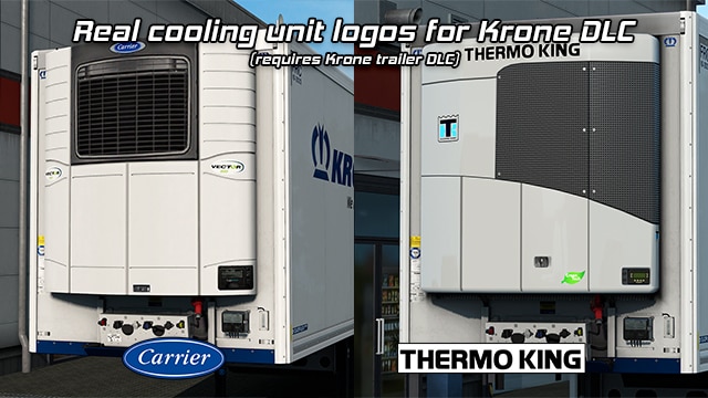 Update: Support for 1.44 game version. Game version: [1.35.*] - [1.44.*]+ KRONE TRAILER DLC REQUIRED OWNABLE TRAILERS ONLY Mod replaces the fake logos on the cooling unit on the Cool Liner with their real life counterpart. Mod also adds a second unit to choose: Thermo King SLX Name changes: Cooler > Carrier Some decals and details might not be 100% accurate, but I will fix that whenever I get better reference material. Credits: obelihnio |