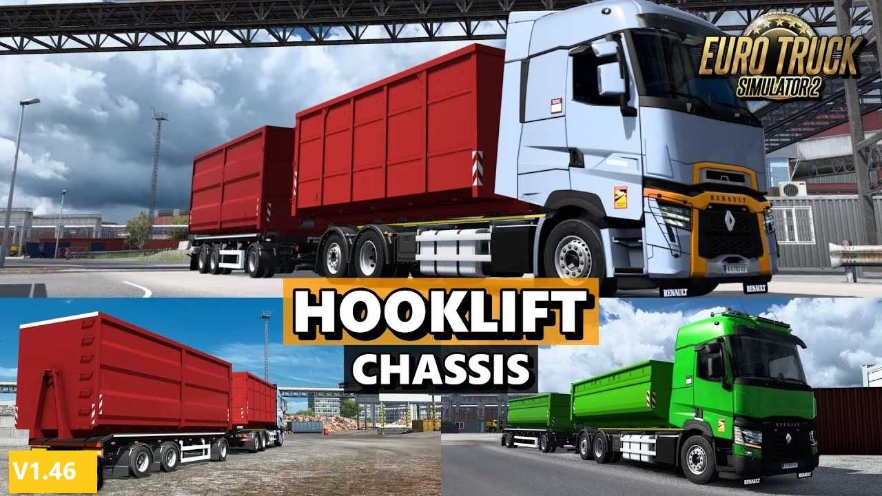This mod gives you new hooklift chassis variant for SCS Renault T trucks. Features: 2 containers (with template (located in archive)) standard tuning (fenders, sidewall, rear lights) liftable/steerable axle advanced coupling clean log missing in interior PTO panel known issue (trailer cables dont work and I gave up this fight after half a day of solving where is problem) Chassis have own definition, so there are no conflicts with other mods Compatible with truck mod Renaul T, C, K by Aryan, i just create new definition for it Compatible with any mods Update for 1.46.2.13s Credits mirusox Credits: mirusox |
