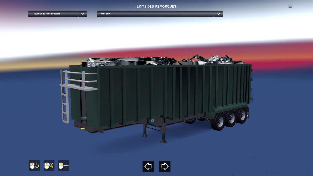 Hi all, My first modification on a trailer mod, so something not be perfect. I updated and adaptated an 4 years old trailer to ETS2 v1.38 All work done using Zmodeler3. Cables trailer implemented but not working (first time i try it). Z3d file included in vehicle/trailer_eu/scrap_trailer/ if someone want to update it. Trailer updated/modified using TRAX trailer as model Includes basic functions : -lights -brace on/off -advanced coupling UVmapping (for template) planned but don’t know when. Credits: – Ashley Willman (base trailer) – Mark Jackson (scrap load) – Mahad110 (adaptation to 1.38, errors fix, 3D corrections, materials, names….) Credits: Ashley Willman |