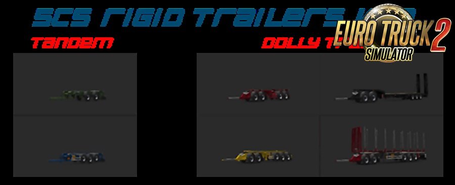 New Version 1.3: -Log 1ax dolly trailer -Conteiner dolly trailers -Conteiner C doubles -Conteiner D doubles -Flatbed 1ax dolly trailer -Flatbed dolly trailers -Flatbed C doubles -Flatbed D doubles -Dolly with SP whels -Icons -Cargo -Tuning -Flatbed B doubles (non rigids) Features: - For this mod you need to have ETS2 v1.35 and does not require any dlc. - This mod make ridigd trailers from SCS models Credits: Teklic |
