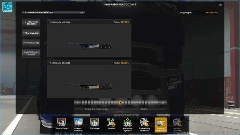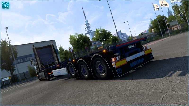Updated – SGD TP : v1.0.3 INFORMATION: Updated and fixed some mistakes Removed restored quick job and traffic trailers Features Tuned krone container trailer 20, 40 feet etc. Cistern Cilo Tuning reverse lights 8 smalllights 6 discs 3 signs rear signs 6 rear lowbar 6 right lowbar 2 side plates SCS “Aero curtain” trailer from ETS2 before 1.32 Updated for 1.46x Credits: SGDESIGN |