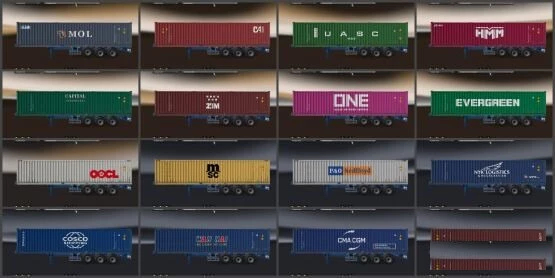 This mod takes a bit time to load in HDD systems. This pack includes 40ft, 2x20ft & 20ft Dry Shipping Containers of total 80 types of Real shipping companies all around the globe. Both, Freight market and Cargo market for owned trailer Jobs are available. Freight market Note: If some container look blank that you want to take as a job then visit the company click the gear icon in the job thumbnail and choose appropriate container. Compatible Ownable Trailer for Cargo Market note: Supported Trailer Chassis(upgrade those in order to get Cargo market job): **40ft Container supported chasis: (3 axles,40feet);(3 axles,flexible,40feet);(3 axles,extendable,40ft). **20ft Container supported chasis: (2 axles,20ft);(3 axles,20ft);(3 axles,extendable,20ft) **2x20ft Container supported chasis: (3 axles,flexible,2x20ft);(3 axles,extandable,2x20ft) **All Krone Boxliner chassis are supported. Choose/Upgrade correct chassis according to the size of the container. **Standard Flatbed Trailer: Upgrade Chassis to “Floor with container Pins” & apply Red or Green paint on it(20ft,40ft). 40ft & 20ft Containers are Listed below: APM Maersk, APL, CAI, Capital Intermodal, CMA CGM, Cosco, Cronos, China Shipping(40ft only), Evergreen, Hamburg Sud, Hanjin, Hapag-Lloyd, Hyundai, K Line, KMTC, Matson, MOL, MSC, NYK Line, ONE, OOCL, P&ONedlloyd, Pacific Internationals Ltd(PIL), Safmarine, Seaco, TEX, Triton, UASC, WAN HAI, Yang Ming, DongFang(20ft only) & ZIM. 2x20ft Containers are Listed Below: COSCO 2x, MAERSK 2x,EVERGREEN 2x,HAMBURG SUD x CAI,CMA CGM x OOCL,MSC x matson, HAPAG LLOYD x UASC,NED LLOYD x Cronos,Yang Ming x Hanjin,ONE x Kline,ZIM x IRISL, APL x MOL,PIL x Wan Hai,HMM x KMTC,China SHipping x Dong Fang,Nyk Line x Capital Seaco x tex,Triton x Safmarine Changelog: 1. Total 80 variants of new Containers with different combinations. 2. Added 20 types of AI traffic Containers(40ft). 3. Each container has individual cargo thumbnails on Cargo Market. 4. Design improvement on each container. New look on several containers. 5. 31 types of 20ft containers & 17types 2×20 containers. And much more. *40ft 9’6″ high cube container pack coming soon. **Supported Game version: 1.40 only. Credits Satyanwesi, Seifer 1968, m1keY & Mods Studio 2 Credits: Satyanwesi, Seifer 1968, m1keY & Mo |