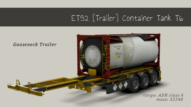 Name: Dangerous Cargo - Container Tank T6 Truck: All Game: Euro Truck Simulator 2 Game Version: 1.41.* or above Author: SASq Info about ETS2 [Trailer] Container Tank T6: Trailer Model: SCS Software Trailer Modification: SASq Cargo: SASq Container Tank T6: Mass: 32t Group: ADR, liquid ADR class: 6 NOTE1: Maybe you need to rest several times before you can see the "Container Tank T6" in jobs list. NOTE2: You can find the trailer in game trailers reviews: section: "Gooseneck" cargo: "Container Tank T6 Gooseneck" Trailer is standalone. Credits: SASq |