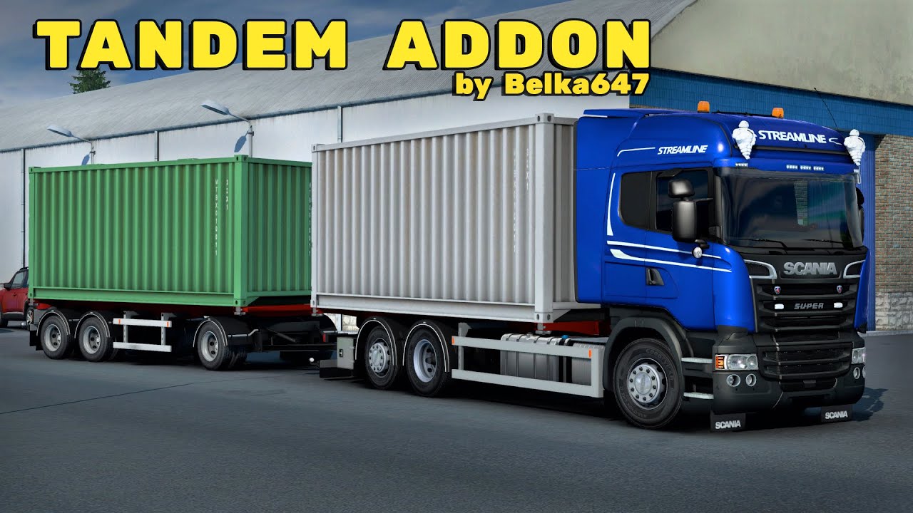 The modification adds a container chassis for Scania RJL and a new ekeri trailer container carrier. Chassis for Scania RJL has two color options, basic tuning, the ability to install a container at the service. The ekeri container trailer is completely autonomous and built from scratch, has two chassis colors, a small basic tuning and supports the installation of a container when ordering. Version 1.0 Added container body from RJL Scania Added ekeri chassis container body Added red chassis The “Tandem addon” is an addition to the modification “Scania RJL tandem addon by Kast” and “Ekeri tandem trailer by Kast”. For this modification to work, you must set it as a priority above the main modifications: — Your other modifications — Tandem addon by Belka647 — Ekeri addon tandem trailers — Ekeri trailers — Tandem addon for RJL Scania — RJL Scania — Your other modifications The list of your modifications may be different, it does not matter. How can I get it in the game? To install a container chassis for RJL Scania, you must select any chassis 4500, to install a container on it, you must select its slot at the end of the chassis in the service. To install a container chassis for an Ekeri trailer, you need to select a container body. After loading the cargo, you will receive a container installed on it. Credits: Belka647 |