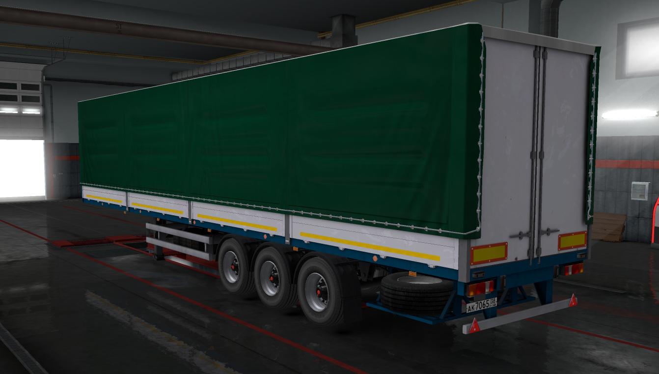 Flatbed Semitrailer MAZ-9758-30хх The ability to gather 2 models p\p (975830-3012 and 975830-3021) versions of the awning. -Completely baked. -Lightmask. -You can buy it at property. -Cable support. -There is tuning: -Frame (3 colors) -body (3 colors) -2 types of rear bumper (new and old model) -2 a tent (Tent with gate, fully tilt with the Board) -Wings (separate and 2 wings front and rear) -Reflective stripes on the side and awning. -Awning can be painted and draw skins on it. -Protection of tanks 2 options. Changes v1.1: - Added missing shadows and reworked old ones. - Made pattern. - Fixed some bugs. - Added cable holder. - Side protection now in tuning+added black option. - Made lightmask,now all the lights are on. The template is attached in the archive. DESKPRO, Igor Samson, Ventyres, Gaykov Credits: DESKPRO, Igor Samson, Ventyres, Gay |