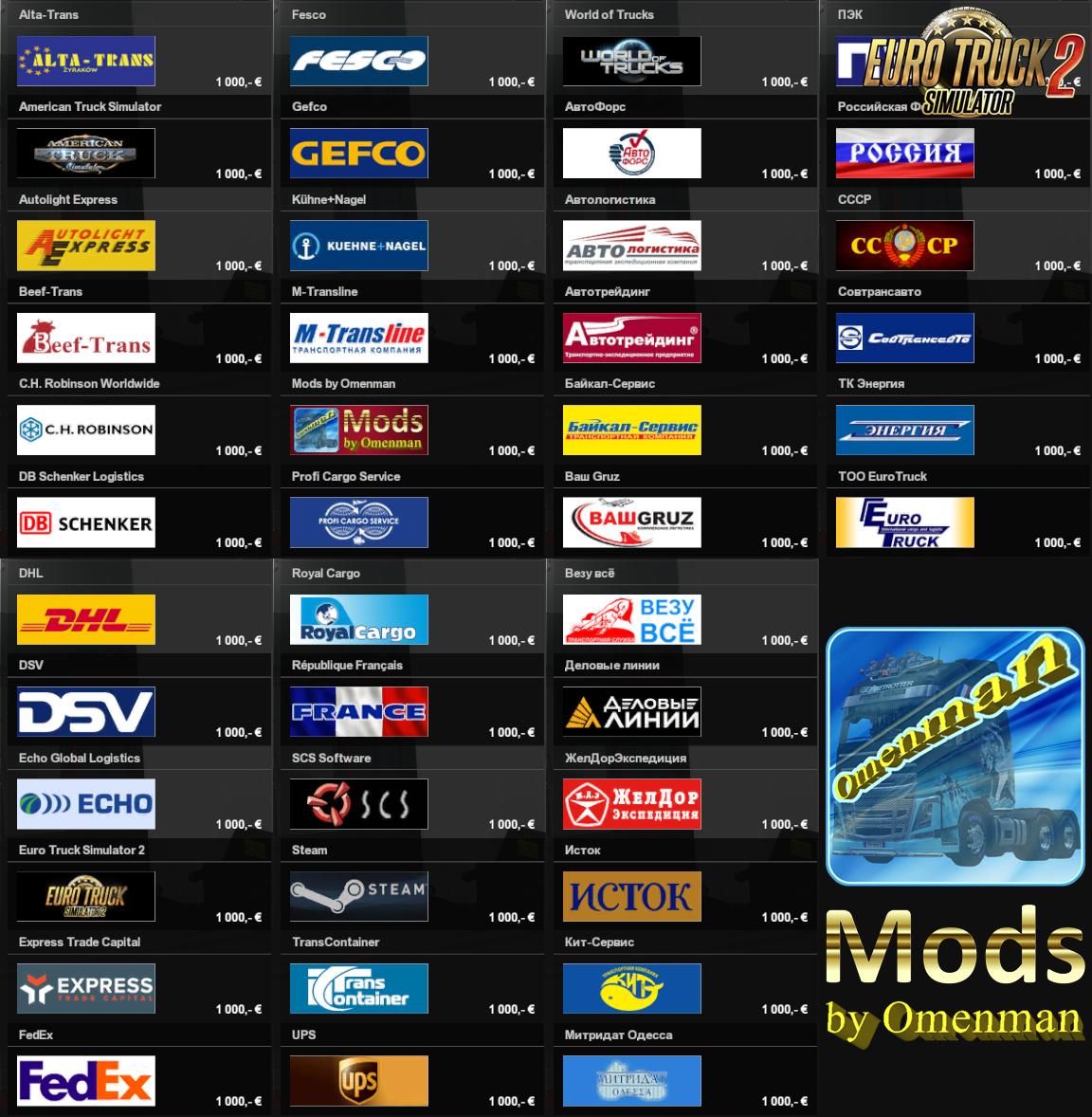Mod of skins for the trailers-ownership. Package of 42 skins: - Alta-Trans - American Truck Simulator - Autolight Express - Beef-Trans - CH Robinson Worldwide - DB Schenker Logistics - DHL - DSV - Echo Global Logistics - Euro Truck Simulator 2 - EuroTruck - Express Trade Capital - FedEx - Fesco - France - Gefco - Kuehne & Nagel - M-Transline - Mods by Omenman - Profi Cargo the Service - Royal Cargo - the SCS Software - Steam - TransContainer - UPS ground - World of Trucks from the - Avtologistika - Auto Trading - AvtoFors - Baikal-Service - Your gruz - Vezu everything - Business lines - ZhelDorEkspediciya - Istok - Kit - Mithridates Odessa - PEC - Russia - Sovtransavto - USSR - Energy New Changes in version 1.02.03: 1. The manifest has been updated. 2. Updated skins for some trailers. Tested on 1.32 game version To use double trailers on the territory of the entire default card, I recommend to connect the fix: Unlocked Scandinavian semitrailers [1.32] Credits: OMENMAN |