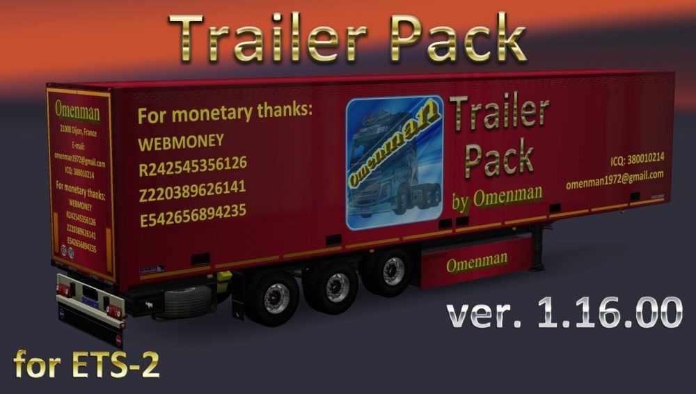 Big package of the trailers with skins from Omenman. In the package 106 company, 70 cargo and 311 skins on 7 trailers (Fuel, Coolliner, Fridge, Profiliner, Container, Schmitz Universal and Rommi Schmitz). This package merges 9 thematic mods and 2 trailers: – Trailer Pack Cars ver.1.02.01 (50 trailers) – Trailer Pack Clothing ver.1.02.01 (19 trailers) – Trailer Pack Electronics ver.1.03.01 (50 trailers) – Trailer Pack Foods ver.1.03.00 (48 trailers) – Trailer Pack Fuel ver.1.02.01 (12 trailers) – Trailer Pack Games ver.1.01.01 (5 trailers) – Trailer Pack Geographic ver.1.02.01 (63 trailers) – Trailer Pack Logistic ver.1.04.01 (32 trailers) – Trailer Pack Stars ver.1.04.01 (30 trailers) – Trailer “Omenman” ver.1.03.00 – Trailer “Istok” ver.1.03.00 Changes in version: 1. Added trailer “Istok” 2. Added 10 trailers from mod “Trailer Pack Foods 1.03.00”: – Starbucks – Subway – Taco Bell – Karusel – Kopeyka – Lenta – Perekrestok – Polushka – Pyaterochka – Yarmarka In the archive 2 files: 1. Base: trailer_pack_by_omenman_xxxxxxx.scs 2. English version of cargo: cargo_pack_by_omenman_eng.scs Modload order: cargo_pack_by_omenman_eng.scs trailer_pack_by_omenman_xxxxxxx.scs For the Russian version, connect only file the base. All trailers are autonomous and included in the traffic. No support for cables For version 1.31 Authors: SCS, Omenman Credits: Omenman |