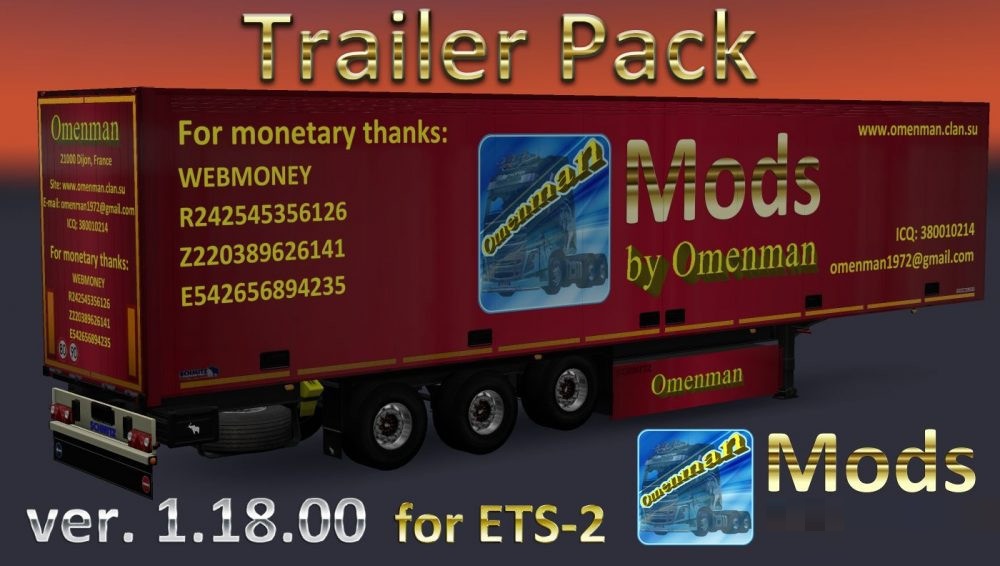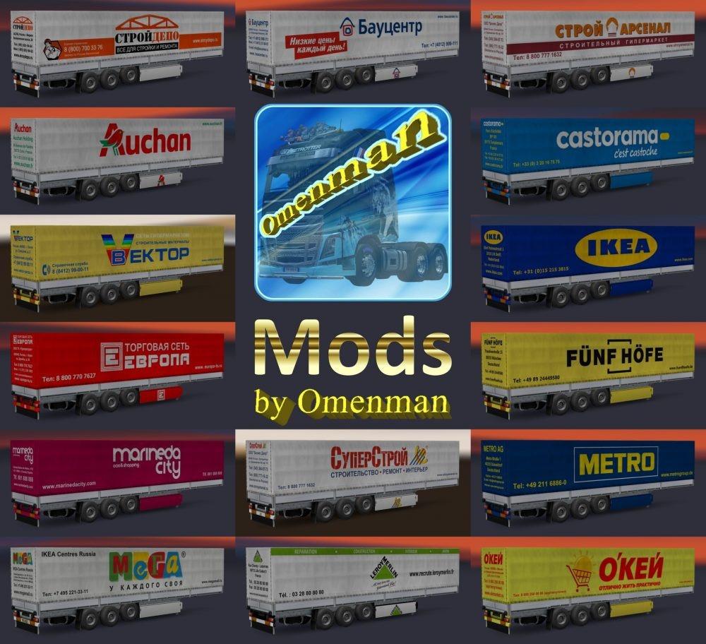 Big package of the trailers with skins from Omenman. In the package 106 company, 74 cargo and 340 skins on 7 trailers (Fuel, Coolliner, Fridge, Profiliner, Container, Schmitz Universal and Rommi Schmitz). This package merges 11 thematic mods and 2 trailers: – Trailer Pack Cars ver.1.02.01 (50 trailers) – Trailer Pack Clothing ver.1.02.01 (19 trailers) – Trailer Pack Electronics ver.1.03.01 (50 trailers) – Trailer Pack Foods ver.1.03.00 (48 trailers) – Trailer Pack Fuel ver.1.02.01 (12 trailers) – Trailer Pack Games ver.1.01.01 (5 trailers) – Trailer Pack Geographic ver.1.02.01 (63 trailers) – Trailer Pack Logistic ver.1.04.01 (32 trailers) – Trailer Pack Mails ver.1.01.00 (14 trailers) – Trailer Pack Malls ver.1.01.00 (15 trailers) – Trailer Pack Stars ver.1.04.01 (30 trailers) – Trailer “Omenman” ver.1.05.00 – Trailer “Istok” ver.1.05.00 Changes in version: 1. Updated skin of the manifest. 2. Updated the skin of the trailer “Omenman” ver.1.05.00. 3. Added new cargoes 4. Added 15 trailers from new mod “Trailer Pack Malls ver.1.01.00”: – Auchan – Castorama – Fünf Höfe – Ikea – Leroy-Merlin – Marineda City – Mega – Metro – Baucenter – Vector – Europe – O’Key – StroyArsenal – StroyDepo – SuperStroy In the archive 2 files: 1. Base: trailer_pack_by_omenman.scs 2. English version of cargo: cargo_pack_by_omenman_eng.scs Modload order: cargo_pack_by_omenman_eng.scs trailer_pack_by_omenman.scs For the Russian version, connect only file the base. All trailers are autonomous and included in the traffic. No support for cables. For version 1.31 Authors: SCS, Omenman Credits: Omenman |