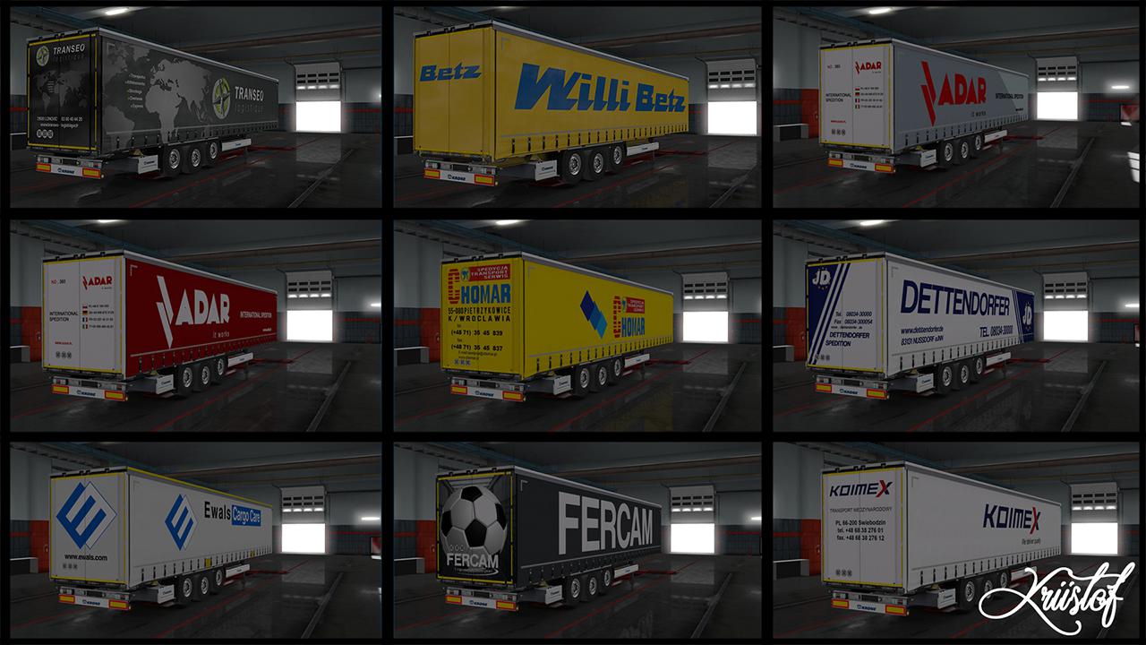 NEW UPDATE 04/02/19 Hello Pack Skins DLC Krone only purshasable ****40 Skins Profiliner + double**** NADOKO – WILLY BETZ – MOELLER – BGL – BERNARD GIRAUD – BREGER – BRUYER – TRANSEO – BOUDIER – KORNER – PEROCHEAU – CARS&CARGO – GEODIS SNCF – SITRANS – GEODIS – BOURRAT- PORTMANN – BLONDEL – BRING – HARTL – PERRENOT – VOGEL – DELISLE – STB – VUYLSTEKE – ADAR (RED) – ADAR (GRIS) – ADAR (BLACK) – CHOMAR – DETTENDORFER – EWALS – FERCAM – KOIMEX – MGE – SCHOTPOORT – STRABERT – TRANSLOCAUTO – WALLENBORN – TRADE UNION – GILLES TRANSPORTS ****36 Skins Coolliner **** G7 – HERVOUIN – JH MESGUEN – SONCOTRA – MOUSSET – GARTNER – BRING – PREVOTE – EDDIE STOBART – GILBERT DE CLERCQ – FM LOGISTICS – BECKER – MARCHAND – DEMAISON – PELLET MOINE – PREVOST – P.BONNART – PRIMAFRIO – TONOLI – GODFROY (old) – BRAXSTONE – STB – JAMMET – STAF Collection Orange – STAF Collection Noir – STAF ( Green ) – STEF – A.BELZUNCES – AG TRANSPORTEN – COLTRANS – DAILYFRESH – FRERET ET FILS – GOES – KENDY – CAUDETTE – BOEKSTIJN – BLONDEL ****10 Skins Dry liner**** ALDI – E.LECLERC – MARCHAND – AUCHAN – CARREFOUR – VISBEEN – PAPALINO – CAMILLO PALMERA – N.DENTRESANGLE – RHENUS Credits: Kriistof |
