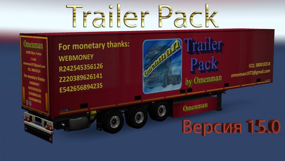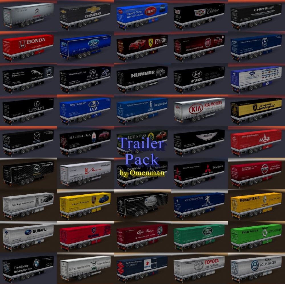 Big pack trailers with skins from Omenman. The package 70 cargo and 300 skins on 7 trailers (Fuel, Coolliner, Fridge, Profiliner, Container, Schmitz Universal and Rommi Schmitz). United 10 mods and 1 trailer: – Trailer Pack Cars 2.0 (50 trailers) – Trailer Pack Clothing 2.0 (19 trailers) – Trailer Pack Drinks 2.0 (26 trailers) – Trailer Pack Electronics 3.0 (50 trailers) – Trailer Pack Foods 2.0 (12 trailers) – Trailer Pack Fuel 2.0 (12 trailers) – Trailer Pack Games 1.0 (5 trailers) – Trailer Pack Geographic 2.0 (63 trailers) – Trailer Pack Logistic 4.0 (32 trailers) – Trailer Pack Stars 4.0 (30 trailers) – And trailers “Omenman” Changes in version: – All skins of trailers are identical with skins of the same name mod for ATS. All trailers are autonomous and included in the traffic. For version 1.30 Authors: SCS, Omenman Credits: SCS, Omenman Credits: Omenman |