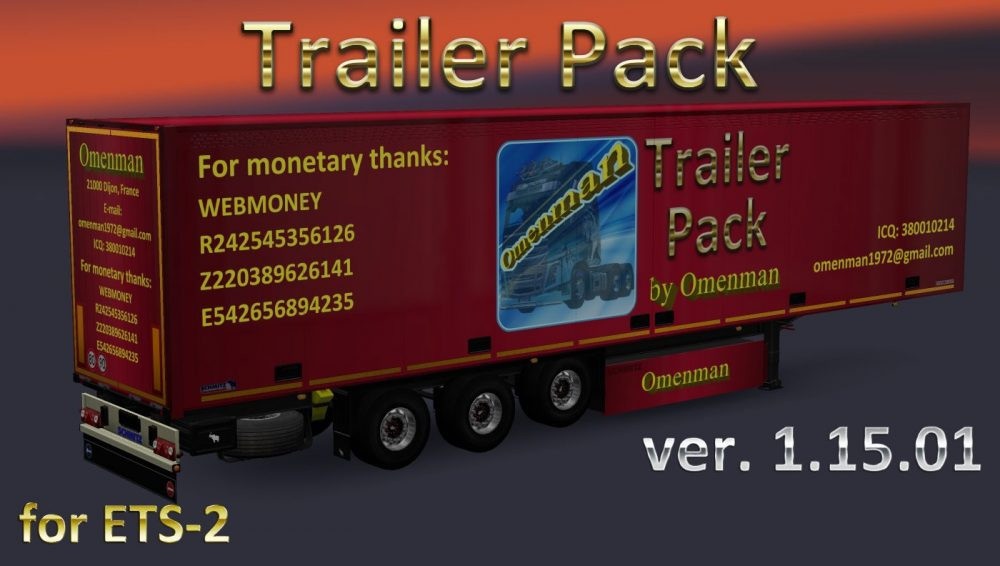 Big package of the trailers with skins from Omenman. In the package 106 company, 70 cargo and 300 skins on 7 trailers (Fuel, Coolliner, Fridge, Profiliner, Container, Schmitz Universal and Rommi Schmitz). This package merges 10 thematic mods and 1 trailer: – Trailer Pack Cars ver.1.02.01 (50 trailers) – Trailer Pack Clothing ver.1.02.01 (19 trailers) – Trailer Pack Drinks ver.1.02.01 (26 trailers) – Trailer Pack Electronics ver.1.03.01 (50 trailers) – Trailer Pack Foods ver.1.02.01 (12 trailers) – Trailer Pack Fuel ver.1.02.01 (12 trailers) – Trailer Pack Games ver.1.01.01 (5 trailers) – Trailer Pack Geographic ver.1.02.01 (63 trailers) – Trailer Pack Logistic ver.1.04.01 (32 trailers) – Trailer Pack Stars ver.1.04.01 (30 trailers) – And trailers “Omenman” ver.1.03.00 Changes in version: 1. Replaced the files “PMG” on all trailers. 2. All files “chassis.sii” are rewritten. 3. Added animation of the hitch. 4. Added English version of cargo. In the archive 2 files: 1. Base: trailer_pack_by_omenman_xxxxxxx.scs 2. English version of cargo: cargo_pack_by_omenman_eng.scs Modload order: cargo_pack_by_omenman_eng.scs trailer_pack_by_omenman_xxxxxxx.scs For the Russian version, connect only file the base. All trailers are autonomous and included in the traffic. No support for cables For version 1.31 Authors: SCS, Omenman Godspeed! Credits: SCS, Omenman Credits: Omenman |