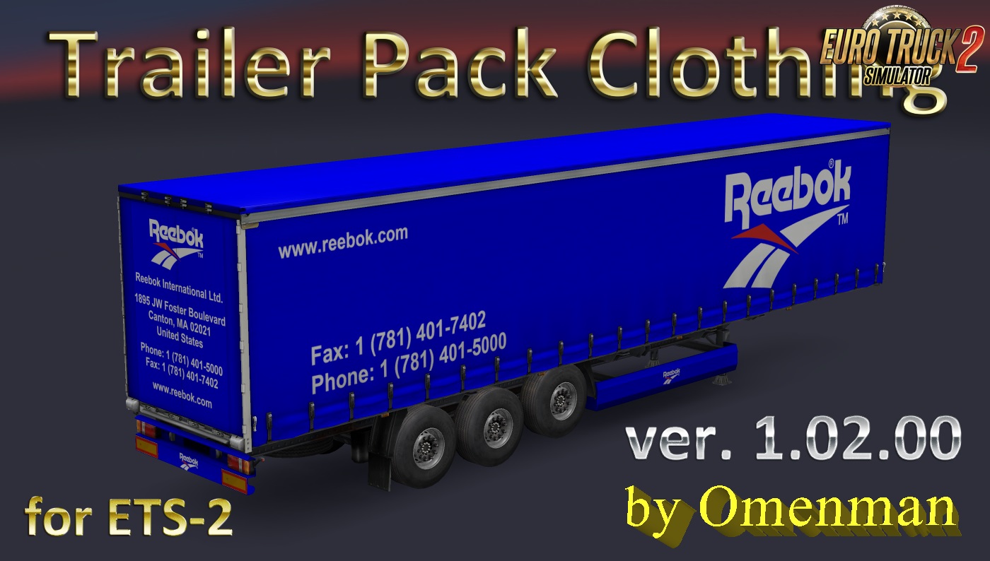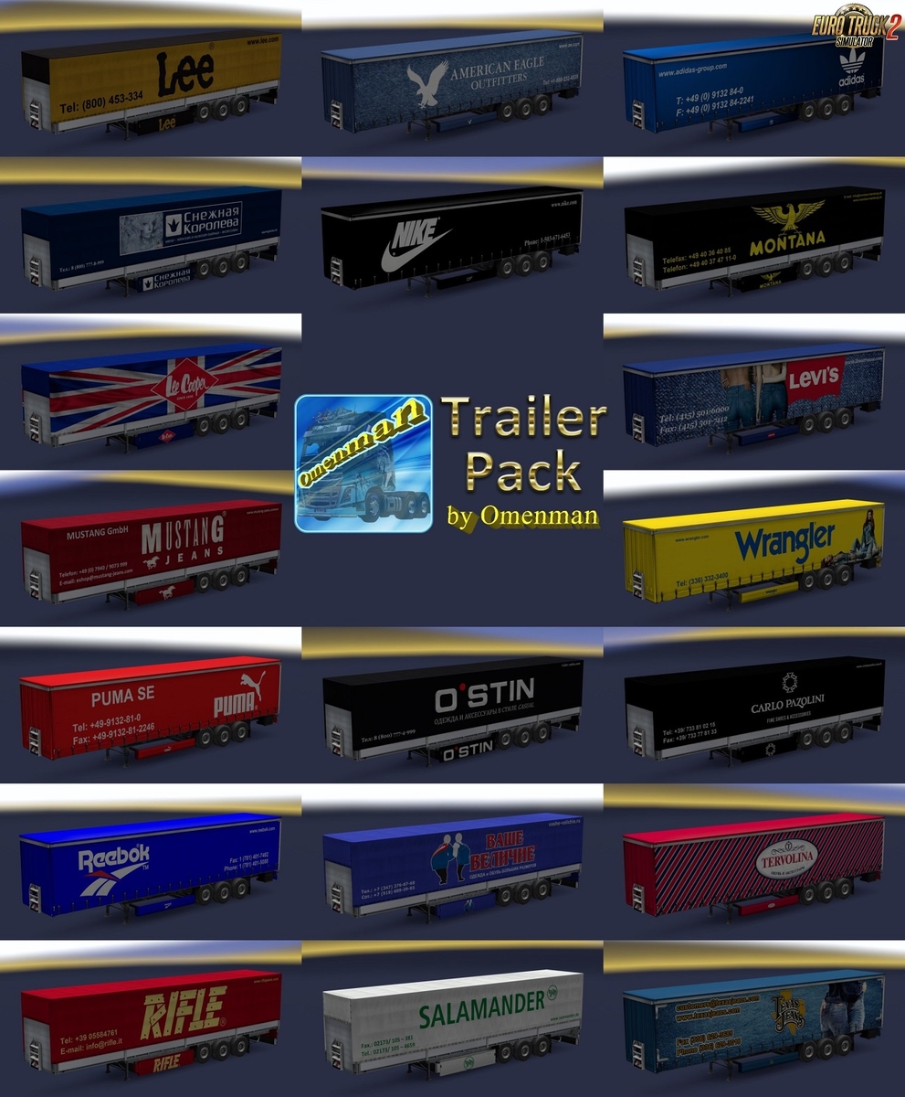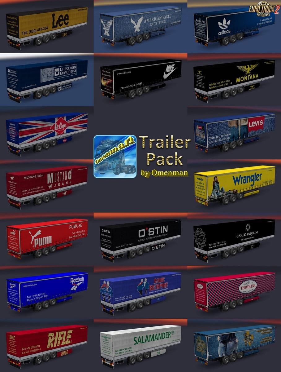 Trailer Pack Clothing v.1.02.00 for Ets2 1.30.x game version This is a mod of trailers with skins of brands clothes and footwear. In the package 38 company, 8 cargo and 19 skins on 2 trailers (Schmitz Universal and Profiliner): – Adidas – American Eagle – Carlo Pazolini – Lee – Lee Cooper – Levis – Montana – Mustang – Nike – O’Stin – Puma – Reebok – Rifle – Salamander – Tervolina – Texas – Wrangler – Vashe Velichie – Snezhnaya koroleva New changes in version: 1. All trailers have a renewed registration of cargoes in accordance with the profiles of companies and types of cargo. 2. Added companies from DLC “Vive la France!” and DLC “Italia”. 3. Changed the format of the package version. All trailers are standalone and included in the traffic. For game version 1.30.x Credits: Omenman |