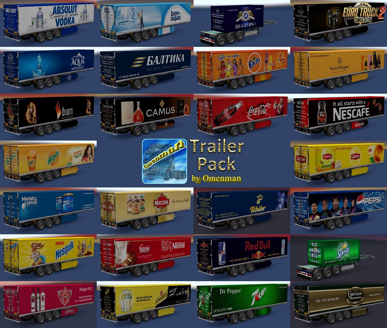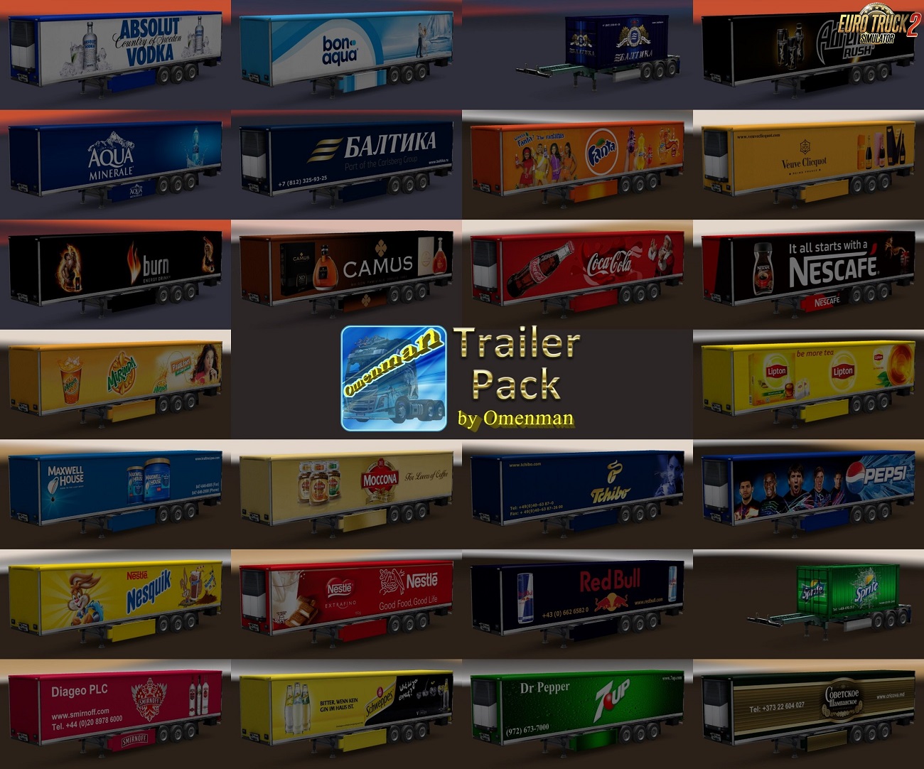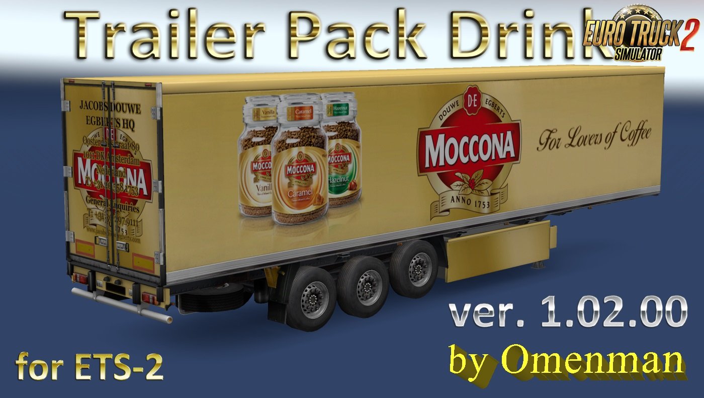 Trailer Pack Drinks v1.02.00 for Ets2 1.30.x game version This is a mod of trailers with skins of drinks. In the package 44 company, 11 cargo and 26 skins for 3 trailers (Coolliner, Fridge and Container): – 7Up – Absolut Vodka – Adrenaline Rush – Aqua Minerale – BonAqua – Burn – Camus – Coca-Cola – Fanta – Lipton – Maxwell House – Mirinda – Moccona – Nescafe – Nesquik – Nestle – Pepsi – Red Bull – Schweppes – Smirnoff – Sprite – Tchibo – Veuve Clicquot Ponsardin – Baltika (2 trailers) – Sovetskoe Сhampanskoe New changes in version: 1. All trailers have a renewed registration of cargoes in accordance with the profiles of companies and types of cargo. 2. Added companies from DLC “Vive la France!” and DLC “Italia”. 3. Changed the format of the package version. All trailers are standalone and included in the traffic. For game version 1.30.x Credits: Omenman |