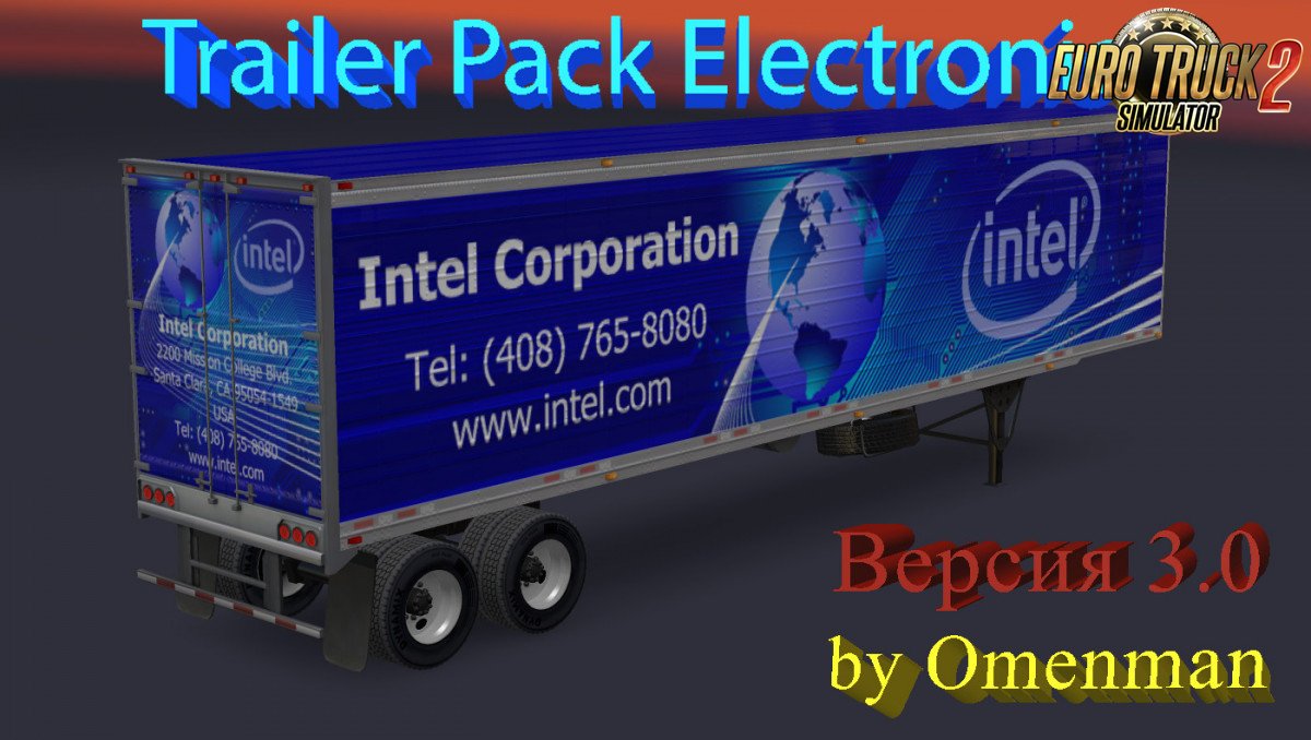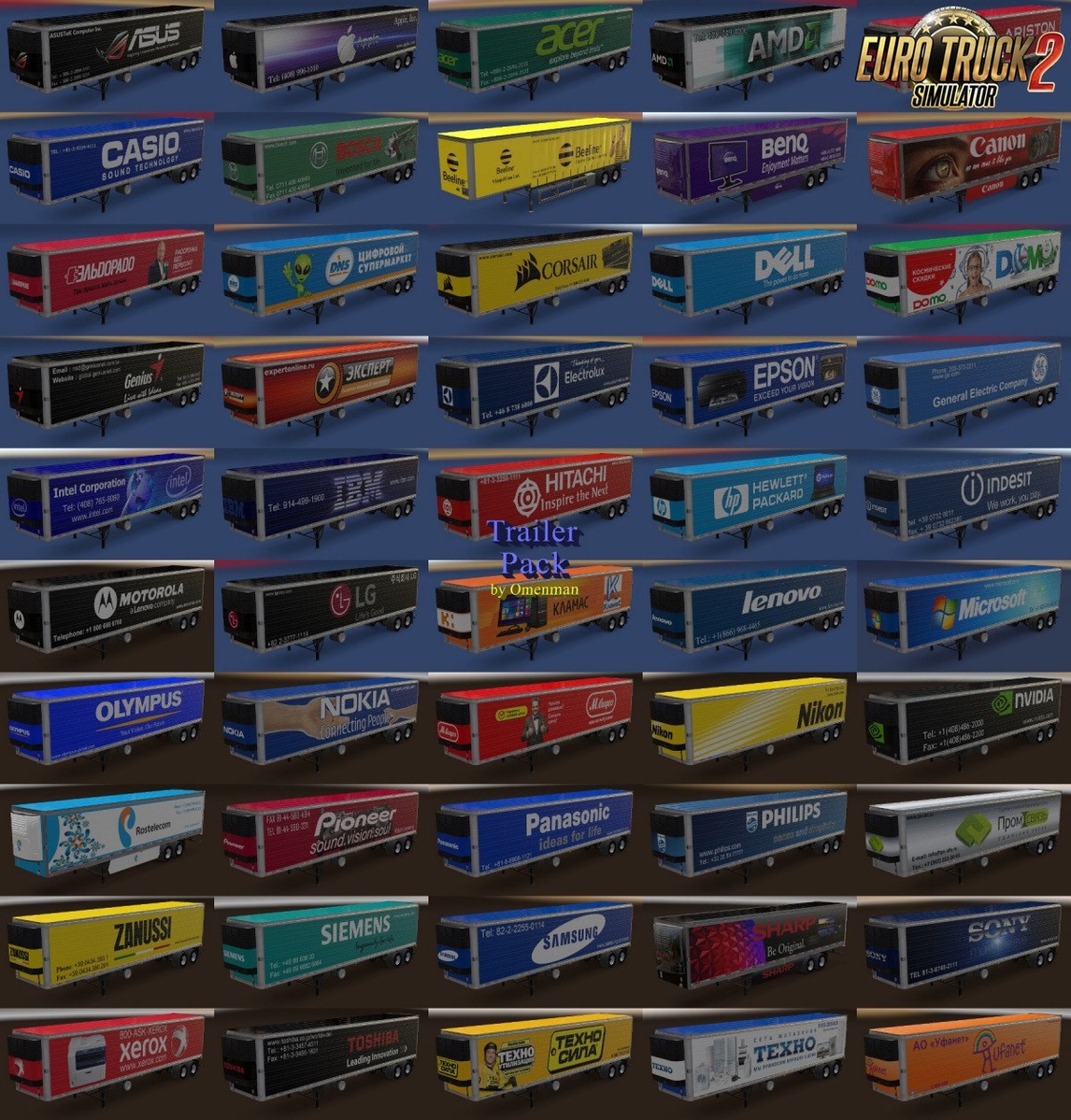 Mod of trailers with skins of brands electronic technics. In the package 22 cargo and 50 skins on 2 trailers (Schmitz Universal and Profiliner): – Acer – AMD – Apple – Ariston – Asus – Beeline – BenQ – Bosch – Canon – Casio – Corsair – Dell – DNS – DOMO – Electrolux – Epson – General Electric – Genius – Hitachi – hp – IBM – Indesit – Intel – Lenovo – LG – Microsoft – Motorola – Nikon – Nokia – nvidia – Olympus – Panasonic – Philips – Pioneer – Samsung – Sharp – Siemens – Sony – Toshiba – Xerox – Zanussi – Klamas – M.Video – Promsvyaz – Rostelekom – Techno – Technosila – Ufanet – Expert – Eldorado Changes in version: 1. Updated the skins of trailers. 2. Trailers are synchronized with the same-name mod for ATS. 3. In the future all mods for ETS-2 and ATS will be updated in parallel. All trailers are autonomous and included in the traffic. If you find any missed errors, report it! For version 1.30 Credits: SCS, Omenman Credits: SCS, Omenman |