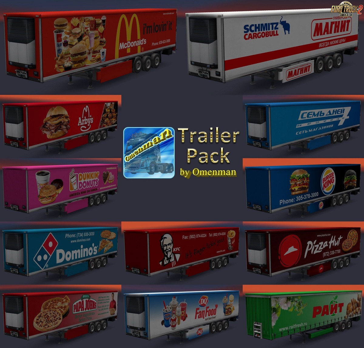Trailer Pack Foods v1.02.00 for Ets2 1.30.x game version This is a mod of trailers with skins of food brands. In the package 45 company, 6 cargo and 12 skins on 3 trailers (Fridge, Coolliner and Profiliner): – 7 days – Arby’s – Burger King – Dairy Queen – Domino’s Pizza – Dunkin’ Donuts – KFC – McDonald’s – Papa John’s Pizza – Pizza Hut – Magnit – Rayt New changes in version: 1. All trailers have a renewed registration of cargoes in accordance with the profiles of companies and types of cargo. 2. Added companies from DLC “Vive la France!” and DLC “Italia”. 3. Changed the format of the package version. All trailers are standalone and included in the traffic. For game version 1.30.x Credits: Omenman |