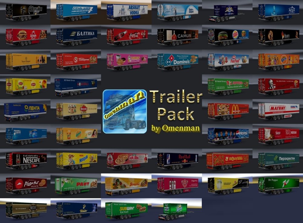 Mod of trailers with skins of food brands. In the package 46 company, 19 cargo and 48 skins on 5 trailers (Fridge, Coolliner, Profiliner, Schmitz Universal and Container): – 7Up – 7 days – Absolut Vodka – Adrenaline Rush – Aqua Minerale – Arby’s – BonAqua – Burger King – Burn – Camus – Coca-Cola – Dairy Queen – Domino’s Pizza – Dunkin’ Donuts – Fanta – KFC – Lipton – Maxwell House – McDonald’s – Mirinda – Moccona – Nescafe – Nesquik – Nestle – Papa John’s Pizza – Pepsi – Pizza Hut – Red Bull – Schweppes – Smirnoff – Sprite – Starbucks – Subway – Taco Bell – Tchibo – Veuve Clicquot Ponsardin – Baltika (2 trailers) – Karusel – Kopeyka – Lenta – Magnit – Perekrestok – Polushka – Pyaterochka – Rayt – Sovetskoe Сhampanskoe – Yarmarka Changes in version: 1. The merged with the mod “Trailer Pack Drinks 1.02.01”. 2. Added 10 new trailers: – Starbucks – Subway – Taco Bell – Karusel – Kopeyka – Lenta – Perekrestok – Polushka – Pyaterochka – Yarmarka All trailers are autonomous and included in the traffic. For version 1.31 Authors: SCS, Omenman Godspeed! Credits: SCS, Omenman Credits: Omenman |