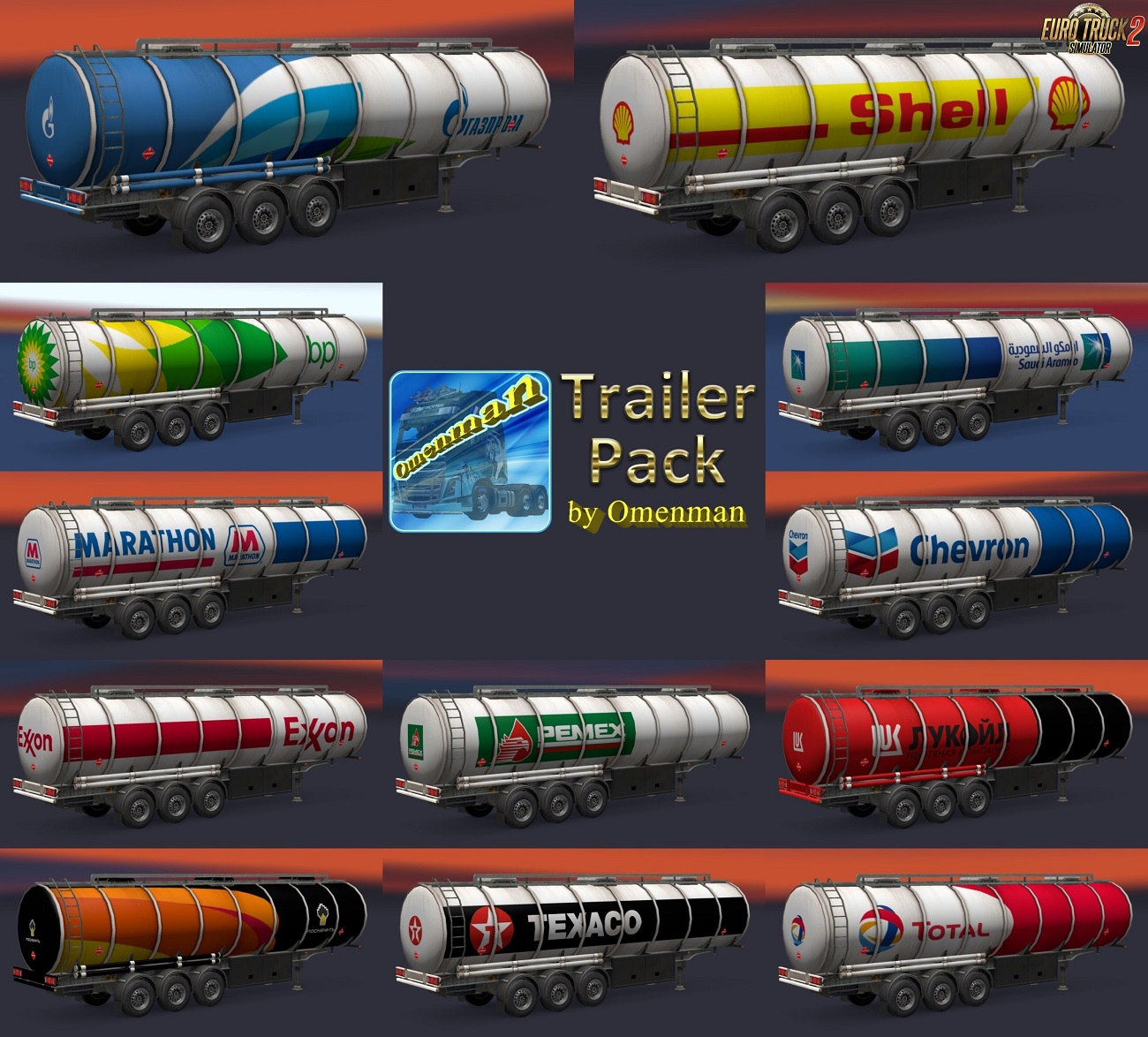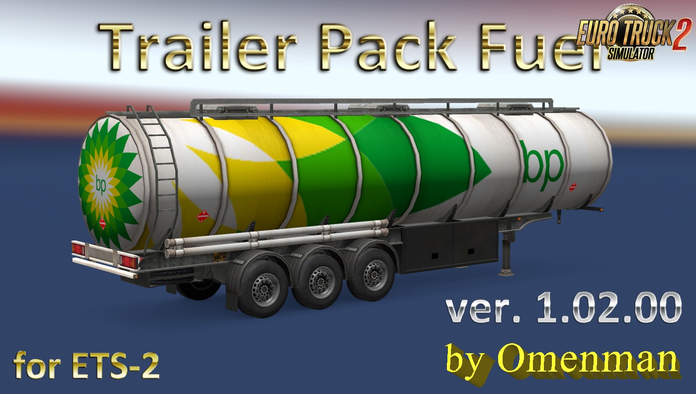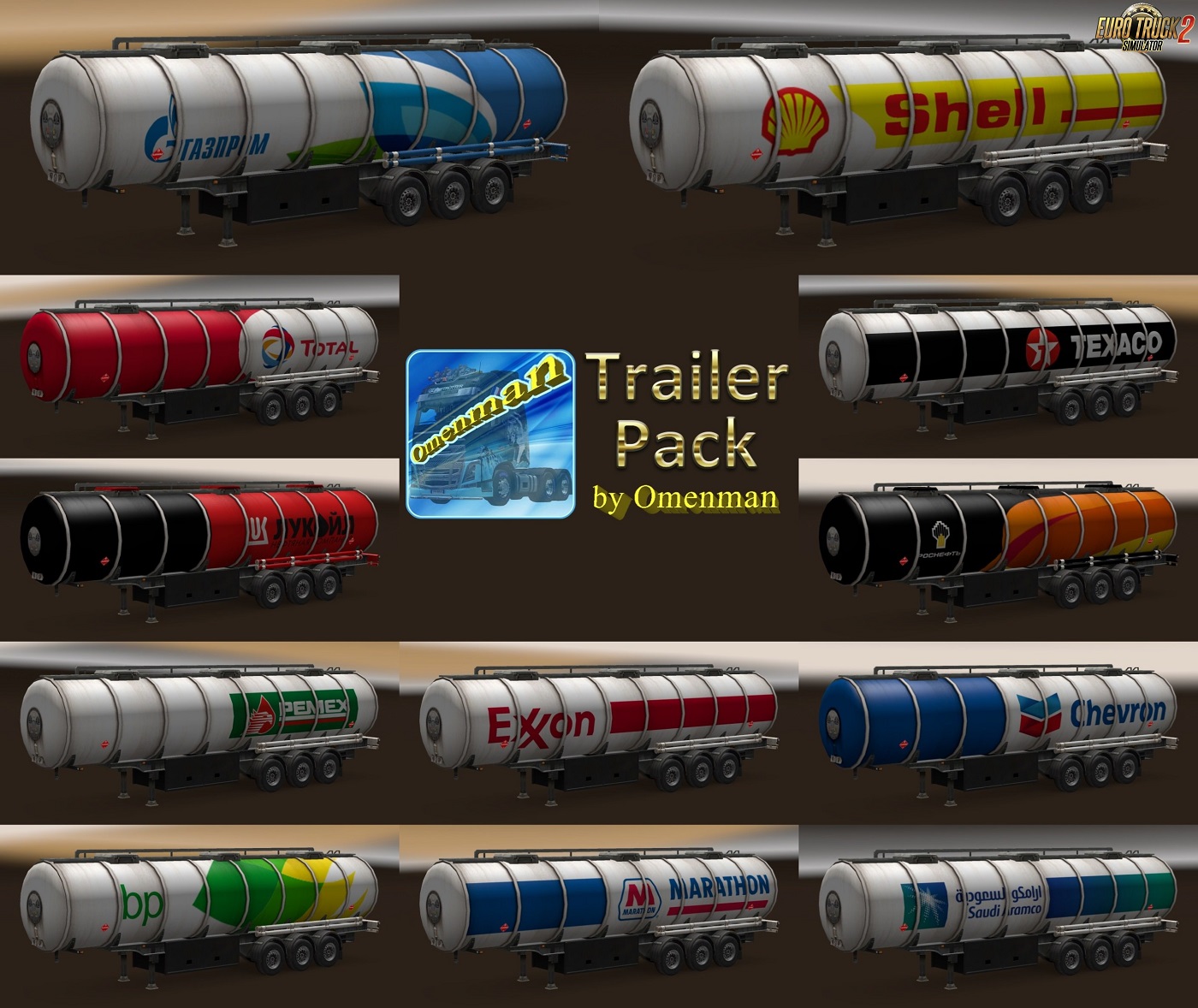 Trailer Pack Fuel v.1.02.00 for Ets2 1.30.x game version This is a mod of trailers with skins of oil and gas companies. You have in the package 89 company, 4 cargo and 12 skins for tank "Fuel": - British Petroleum - Chevron - ExxonMobil - Marathon Petroleum - Pemex - Royal Dutch Shell - Saudi Aramco - Texaco - Total - Gazprom - Lukoil - Rosneft New changes in version: 1. All trailers have a renewed registration of cargoes in accordance with the profiles of companies and types of cargo. 2. Added companies from DLC "Vive la France!" and DLC "Italia". 3. Changed the format of the package version. All trailers are standalone and included in the traffic. For 1.30.x game version Credits: Omenman |