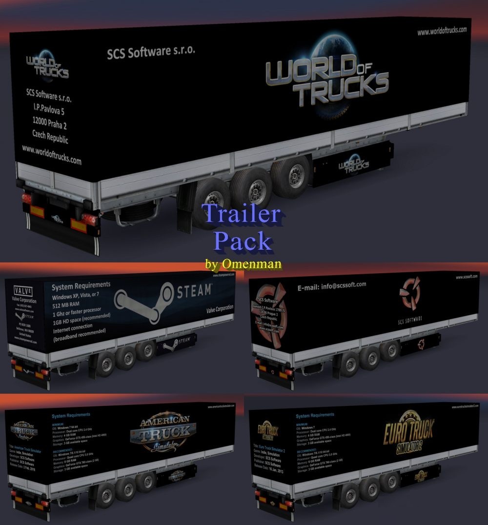Mod of trailers with skins computer games. In the package 5 cargo and 5 skins on trailer “Schmitz Universal”: – American Truck Simulator – Euro Truck Simulator 2 – SCS Software – Steam – World of Truck Changes in version: 1. Updated the skins of trailers. 2. Trailers are synchronized with the same-name mod for ATS. 3. In the future all mods for ETS-2 and ATS will be updated in parallel. All trailers are autonomous and included in the traffic. If you find any missed errors, report it! For version 1.30 Credits: SCS, Omenman Credits: SCS, Omenman |