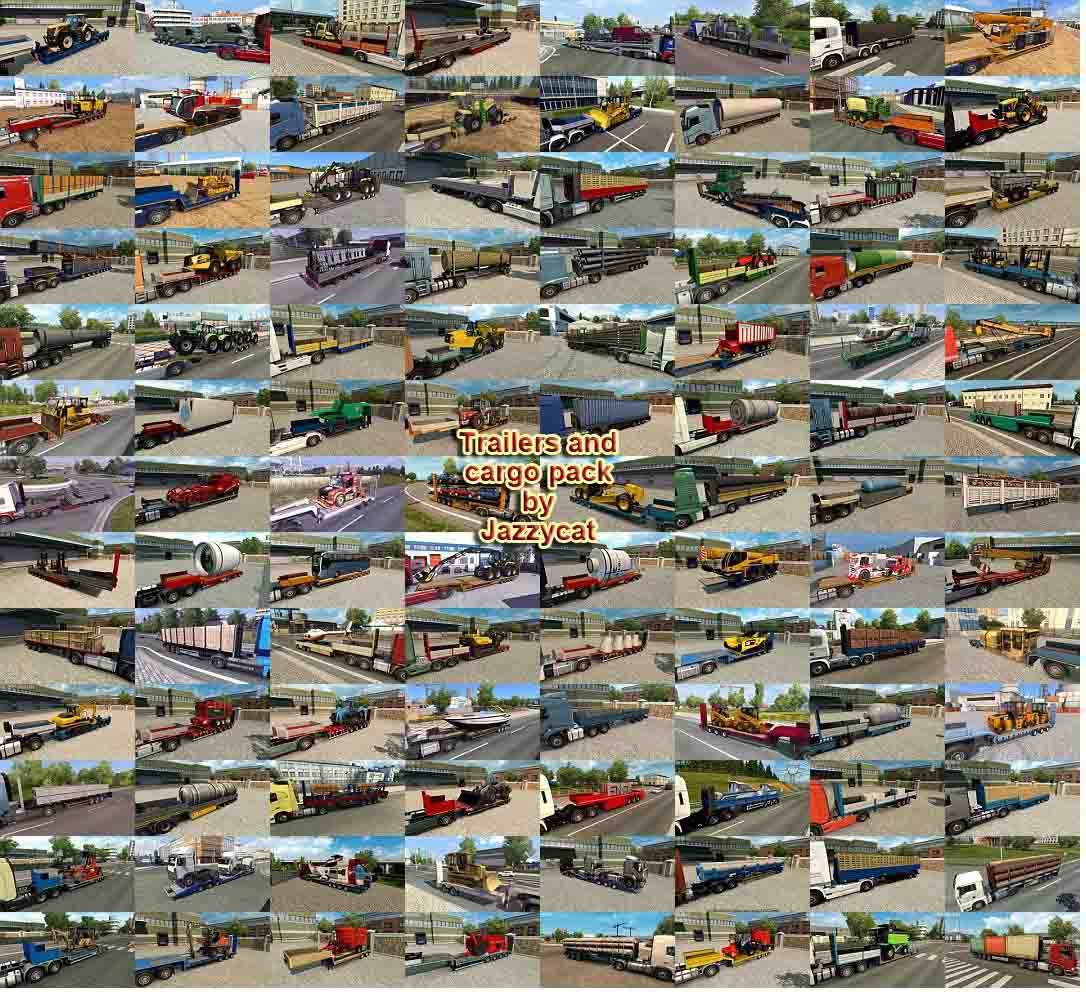 Version 9.8 - added new cargo for overweight trailers (different airport equipments) Pack adds in game 173 new models of trailers (different trailers by Kögel, Fliegl, Böse, Närko, Lamberet, Chereau, Schmitz, Bodex, Wielton, D-Tec, Fruehauf, Schwarzmüller, Kassbohrer, Rolfo, Samro, Krone, Pacton, Ekeri, Goldhofer, Kröger, Aydeniz, Nooteboom, Sommer, NTM, HRD, Estepe, Fontaine, McLendon, Krampe, Kotte, Panav, Kempf, Langendorf, Galtrailer, Michieletto, Groenewegen, Chmzap, Maz, Nefaz, Szap, Tonar, Odaz, Becema and others), 768 new cargo, 744 traffic trailers and about 3000 skins. New cargo added to 419 companies for all popular maps. All standalone. Works on any maps. For version 1.41.x Compatible with all my packs. Included english and russian versions. For english version you must have in mod folder four files: trailers_and_cargo_pack_by_Jazzycat_v9.8_part1.scs trailers_and_cargo_pack_by_Jazzycat_v9.8_part2.scs trailers_and_cargo_pack_by_Jazzycat_v9.8_part3.scs trailers_and_cargo_pack_by_Jazzycat_v9.8_eng.scs Credits: Jazzycat |