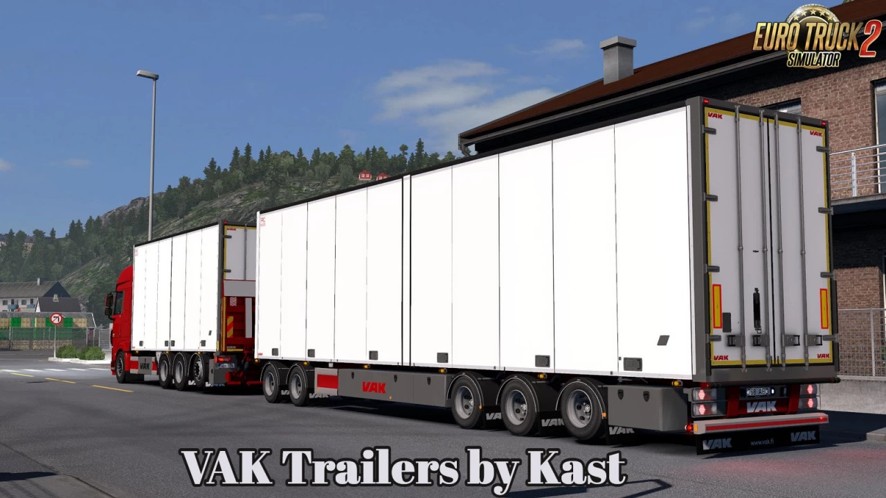 VAK Trailers - in this pack you can find, Semitrailers 4m/4.4m height, two types of trailer with length 19.6m 4/5 axle. This mod will restrict double and long trailers to Denmark, Norway, Sweden, Finland as vanilla game. Features VAK Trailers: - Standalone; - Advanced coupling; - Animated braces; - Lifting axle; - Steer axle; - Company painting system; - Animated props; - Support for cables. The set includes trailers: - 14 variants of VAK trailers - Refrigerated Carrier - Real company skins - Double trailers; - detailed models. Changes v2.7.2: - Adapted to the latest game patch 1.42; - Missing textures fixed. Credits: Kast |