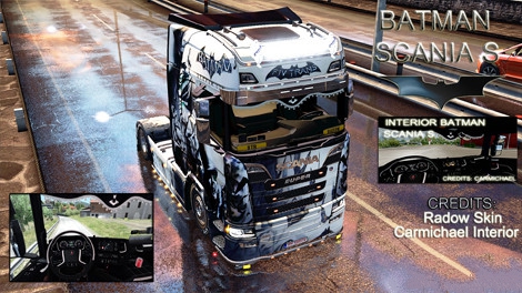 BATMAN SCANIA S ************************************************ CONTENT: -Batman Scania S -Interior Batman Scania S CREDITS: -Radow skin -Carmichael interior -testet on 1.30.x Indication: Too have full paint skin on truck you need all files in arhive to activate in game enjoy ************************************************ Credits: Radow, Carmichael Credits: Radow, Carmichael |