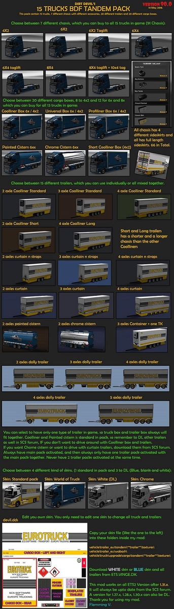 Changelog: Added Mighty Griffin update to Scania S and R Model. Added 72 new vanilla game cargo to pack. Fixed crash from 1.30.x to 1.31.x All 15 Trucks: Scania R 2016 (Including new paintjob code and special fenders) Scania S 2016 (Including new paintjob code and special fenders) Volvo FH16 2012 (+2 extra Volvo FH 2012 cabins) Volvo FH16 2009 Scania rcab 2009 Scania Streamline MAN TGX DAF XF DAF XF Euro6 Mercedes Benz Actros 09 Mercedes Benz Actros 14 Iveco Stralis Iveco Hiway Renault Premium Renault Magnum Chassis: 7 chassis 4x2, 6x2, 6x2 taglift 6x4, 6x4 taglift, 8x4, 8x4 taglift, 10x4 mid/taglift. (Total: 99 chassis) Boxes: 21 different cargo boxes. 8 for 4x2 Chassis and 12 for all other chassis. 1 for 10x4 chassis (Total: 21) Accessories for all chassis, spare tyres, extra tanks, extra battery, extra closet, painted or skined. (Total: 9) 4 different sideskirts for all chassis, one to use with closet and one in full length for each chassis. (Total: 66) 13 different exhaust pipes to the back of cabin for ALL trucks. (Total: 13) Ready for WOTR (Total: over 1700 cargo files) All Trailers: 20 different trailers. (Total: 20) 2 axles Dolly Coolliner, 3 axles Dolly Coolliner, 4 axles Dolly Coolliner, 4 axles Dolly Coolliner and 5 axles Dolly Coolliner. (Total: 5) 2 axles Coolliner, 3 axles Coolliner, 4 axles Coolliner and a 2 axles Short version and a 4 axles Long version. (Total: 5) 2 axles, 3 axles and 4 axles curtain with straps (Profiliner). (Total: 3) 2 axles, 3 axles and 4 axles curtain (Universal). (Total: 3) 2 axles Painted Cistern, 2 axles Chrome Cistern trailer. (Total: 2) 3 axles Container, 3 axles container with Thermo King box. (Total: 2) First link: Trucks https://modsbase.com/9vw2pb3hiupr/dd_tandem_truck_pack.scs.html https://mods.to/k6ajpz2spxtm/dd_tandem_truck_pack.scs.html Second link: Trailer pack https://modsbase.com/d85l4ytskzb1/dd_tandems_trailer_mixed_all.scs.zip.html https://mods.to/ax60ozr2n160/dd_tandems_trailer_mixed_all.scs.zip.html Credits: Flemming V |