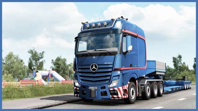 Description: Changes in 1.6.5: – Fixed warnings – by updating headlight defs Changes in 1.6.4: – Added attribute sounds in accessory data (engine, transmission, cabin, chassis, interior) – Fixed “turn signal through interior” – rotated flares Overview: – New Actros & Arocs SLT as seperate vehicles – Two 8×4 chassis in 3300mm & 3900mm length for Actros – Bigspace in 2500mm width for both vehicles – Gigaspace in 2500mm width for Actros – Front bumpers selectable (orignal, SLT) – Rear fenders selectable (original, tearplate in 2 variants) – Badges removable – “Front grill” selectable (plastic, paint) – “Sides/front fenders” selectable (plastic, paint) – Towing hitch selectable (without, straight, tilted) – Set of “heavy cargo plates/signs” – License plates selectable (different positions, texture & generated by the game) – Customizable light plates in large & medium size for both vehicles – Roofbars, new transmission, skins, and more … Additional packages: Big Stars – Compatibility to Cabin Accessories Big Stars – Compatibility to National Window Flags