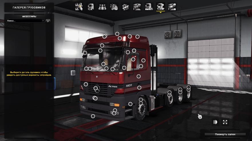 - Standalone - Mercedes Dealer - 1 cabin - 4 European chassis and 4 off-road chassis (severe Russia) - connected with a separate mode off.scs - 9 engines (V8 engines have their own sound) - 3 checkpoints - Your wheels - Your own interior - Metallic paint - A lot of tuning - Mirrors Mirrors - Fixed windshield light - Fixed crayons bugs P.S. Perhaps there are minor flaws in the model, which in the future will be corrected. Mod Adapted to version 1.31.x Attention: you need a SisL Mega Pack, otherwise there will be a red log when choosing toys in the salon! Credits: Emmanuil, Korobasfor |