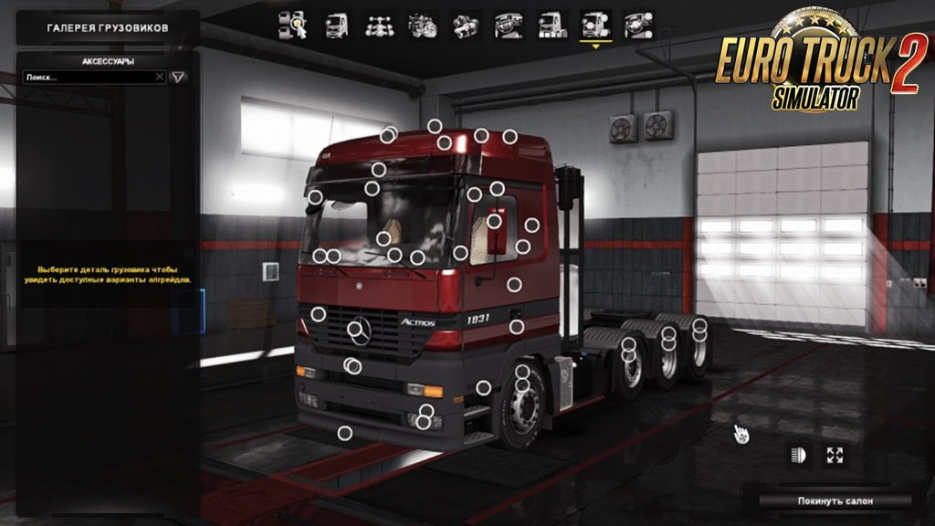 New Changelog: - added standart chassis 6x4,6x2_4 taglift, 8x4. Chassi off-road 6x6, 8x8. (include file off.scs) "Emmanuil" - Fixed mirrors - Fixed glasses - Fixed all textures for 1.35 - Fixed wipers - Fixed animations Features: -Advanced trailer coupling ready. -Flags DLC ready (custom). -Cabin DLC & SiSL megapack compatibility. *Needs SiSL megapack to all cabin accessories work correctly. -Adapted to 1.30 ETS2 game version. -Added missing accessories pics. -Corrected 5th wheel. -Fixed shadows. -Fixed mirrors -Fixed glasses -Fixed some lights. -Fixed seats scale. -Improved exterior cabin quality. -Metallic paints. Tested and works in 1.35.x game version Jav, Emmanuil, Korobasforets, idea, Furkan61, Bymetin44, Gadreel, Ant457, Danz, by_Lexa, Pedro Vendeira, 50 keda, great Kriechbaum for Sound Credits: Jav, Emmanuil, Korobasforets |