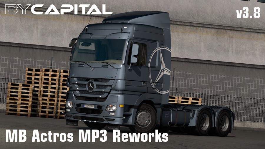This is my rework of the Mercedes Actros MP3 by SCS. This mod adds a lot of plastic, painted and chrome parts which you can choose as you like. It comes with badges for all chassis and engines. It has all standard chassis plus three different low deck chassis and 8×4 chassis for Mecaspace and High sleeper cabs. The mod is for game version 1.32 and above only! Templates can be found here: https://sharemods.com/l5dthdevqihe/MB_Actros_MP3_Reworks_Templates.zip.html Changelog v3.5 to 3.8 Reworked mufflers Reworked skinnable interiors Added new fenders for tag axles Fixed dashboard computer Fixed some bugs And more Credits: Capital SCS Sound made by Leen Dashboard computer made by Piva Custom Bumper Lights by Abasstreppas Lightmasks for headlights by 50keda Textures for heavy duty-fenders and custom bumpers by Kast Def-file fixes by CobraBlue6 Credits: Capital, Leen, Piva, Abasstreppas, 50keda, Kast, CobraBlue6, SCS Credits: Capital, Leen, Piva, Abasstreppas |