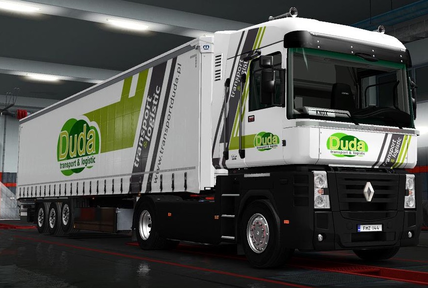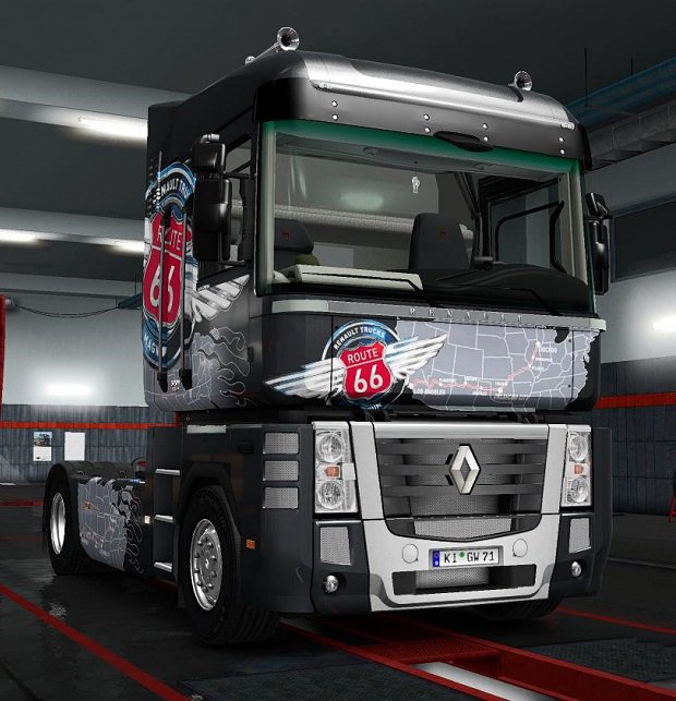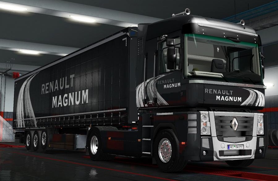 Changes v21.01: * Adaptation to version 1.35 and to DirectX 11 * Updated camera settings * Updated on-board computer * Updated sounds * The lift axle indicator now shows the status of the axle on the trailer (and not on the truck) * Added three chip-tuned engines - for 577, 615 and 677 hp * Added black variant of trailer cables * Added "Route 66 Metallic" skin * Added "Renault Magnum Metallic" skin for Magnum and for Krone trailers * Added "Duda Transport & Logistic" skin for Magnum and for Krone Profiliner trailer * Minor changes on the exterior and interior model * Removed outdated version of wheel chocks This is a complete rework of the standard Renault Magnum. Many options for chassis and tuning All previous versions of this mod, as well as all the fixes to them - delete! The file magnum_updates_v20.03_by_knox_xss.zip should be placed in the mod folder. For tandems (optional): The file magnum_updates_v20.xx_bdf.zip from the "BDF" folder is also located in the mod folder. Scandinavian version of Coolliner added Now all tandem trailers, including the Scandinavian Coolliner, are tied to default weights! - Amendments to the model and textures - Bagfixes and edits - Added cable support - BDF trailers are now available for purchase. Credits: Knox_xss |
