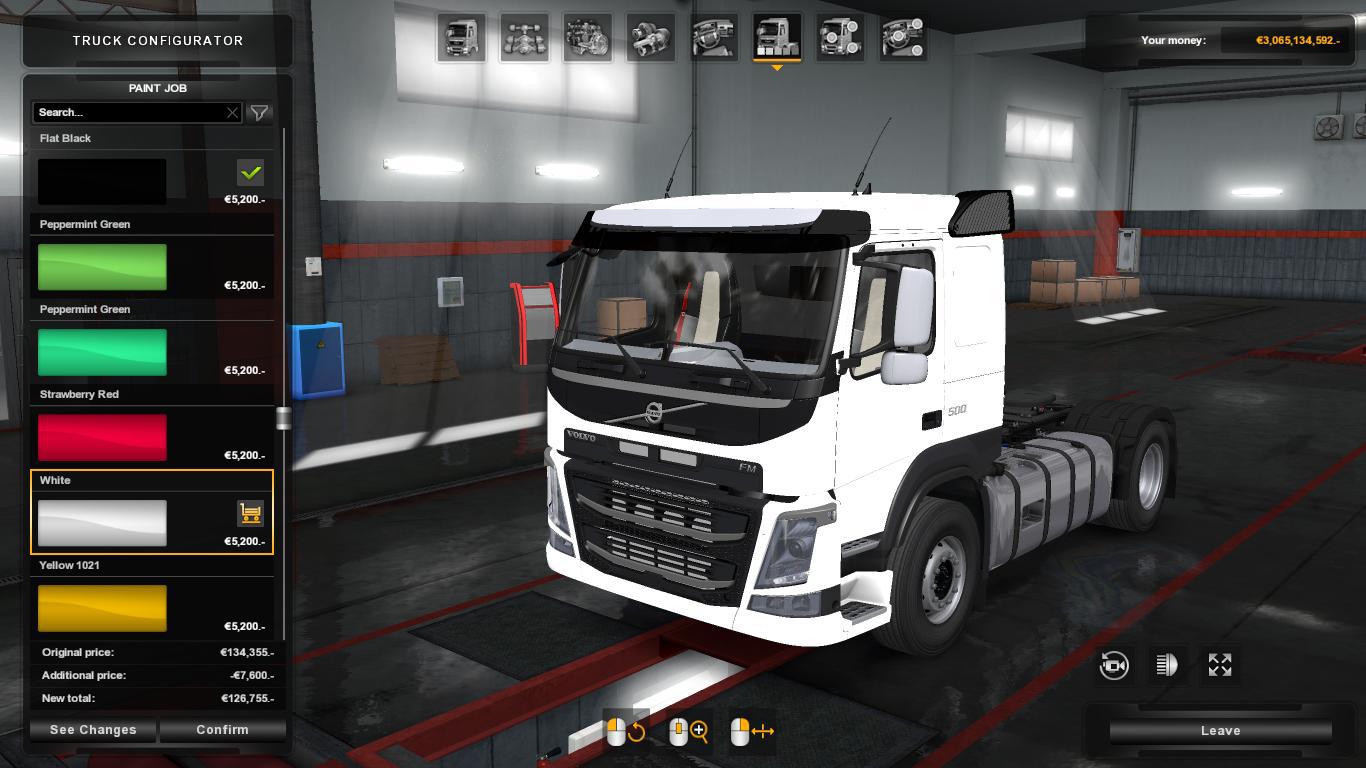 Changes 1.8: Updated engines Changes to transmission files Added slots to front grill Updated template Reworked the spoilers Changes 1.7: Made sunshield removable Fix for patch 1.35 Changed models to volvo_fm Changed def files to volvo.fm Added support for trailer cables Added support for advanced coupling Added correct engines and gearboxes Added badges for each engine Cleanup of model Cleanup of textures Separated spoiler from the cabin Changed Interior to FH 2012 Added and corrected flares Added Day cab Added Interior for Day cab Added Sleeper cab Added Interior for Sleeper cab Separated front fenders Added painted fenders Added icons for major parts 4 Cabs 4x2 chassis 4x2 low deck chassis 6x2 chassis 6x4/4 midlift chassis 6x2 tag chassis 6x4 chassis Credits: galimim |