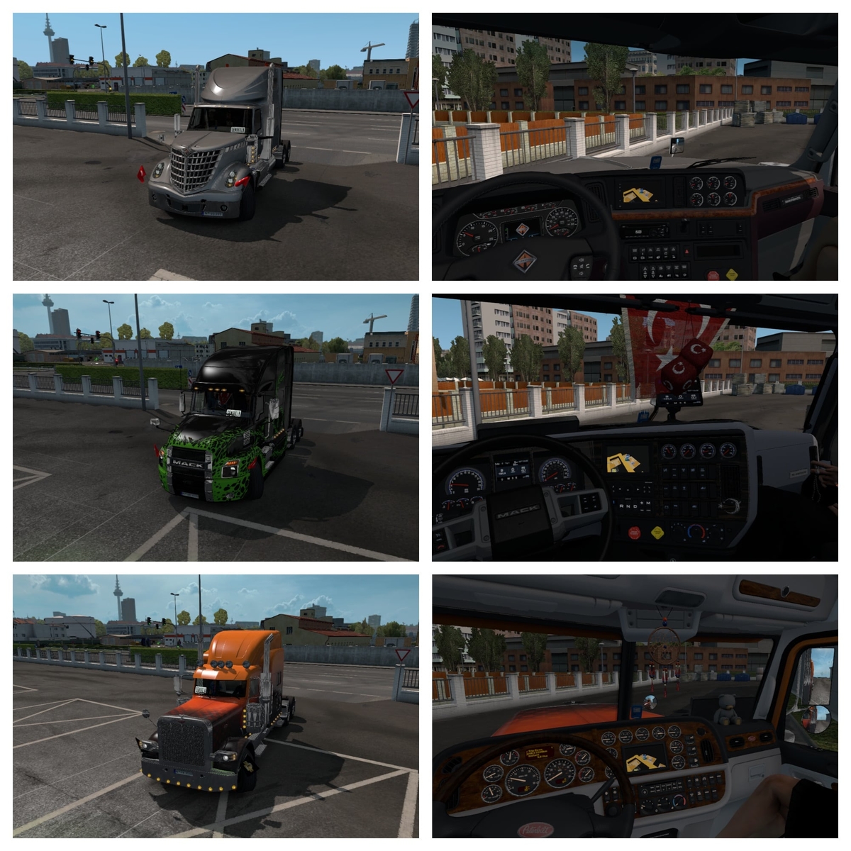 English: You can use all American trucks in ETS 2 now. You can buy it in mod dealer. It contains the following trucks: *Kenworth T680 *Kenworth W900 *Peterbilt 389 *Peterbilt 579 *Volvo VNL *Freightliner Cascadia 2019 *International Lonestar *Westernstar 49X *Mack Anthem Working in 1.39.x game version v5.0 Changelog (New Year Update) -Adapted to version v1.39.x -Added 5 new trucks.(Mack,Freightliner,International,Westernstar,Volvo) -SISl Mega Pack support has been renewed. (SISL MEGA Pack is required for this feature to work) -Added ETS 2 - Windows Flag DLC support. (ETS 2 - Windows Flag DLC is required for this feature to work) v4.0 Changelog -Brought SISL Mega Pack support. (SISL MEGA Pack is required for this feature to work) v3.0 Changelog -Adapted to version v1.31.x -Added trailer cables. v2.0 Changelog -Added front right mirror. -All crashes fixed. ----------------------------------- Türkçe: Artık tüm amerikan tırlarını ETS 2’de kullanabilirsiniz. Mod galerisinden satın alabilirsiniz. Şu tırları içerir: *Kenworth T680 *Kenworth W900 *Peterbilt 389 *Peterbilt 579 *Volvo VNL *Freightliner Cascadia 2019 *International Lonestar *Westernstar 49X *Mack Anthem 1.39.x sürümünde çalışıyor. v5.0 Yenilikler (Yeni Yıl Güncellemesi) -Versiyon 1.39.x'e uyarlandı. -5 yeni tır eklendi.(Mack,Freightliner,International,Westernstar,Volvo) -SISL MEGA Pack desteği yenilendi. (Bu özelliğin çalışması için SISL Mega Pack modu gereklidir.) -ETS 2 - Windows Flag DLC desteği eklendi. (Bu özelliğin çalışması için ETS 2 - Windows Flag DLC gereklidir.) v4.0 Yenilikler -SISL Mega Pack desteği getirildi. (Bu özelliğin çalışması için SISL Mega Pack modu gereklidir.) v3.0 Yenilikler -Versiyon 1.31.x'e uyarlandı. -Dorse kabloları eklendi v2.0 Yenilikler -Ön sağ aynalar eklendi. -Tüm hatalar giderildi. ----------------------------------- Installation Steps - Download the mod - Use WinRAR or 7-zip and unzip the archive; - Copy the file with the extension .scs in My Documents/Euro Truck Simulator/mod folder - Start the game, go to your profile, see the Mod manager and activate the mod. Kurulum Adımları - Modu indirin - WinRAR veya 7-zip programını kullanarak arşivi çıkartın; - Belgelerim/Euro Truck Simulator/mod klasörüne .scs uzantılı dosyaları kopyalayın - Profilinize gidip, mod yöneticisinden modu etkinleştirin. ----------------------------------- This mod is my work. Respect my work, if share keep the original link. Please dont re-apload without the author’s link. You can share videos on YouTube. You can put video link here. Credits: SemihKln, SCS Software |