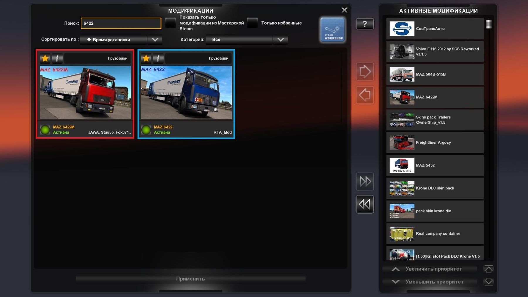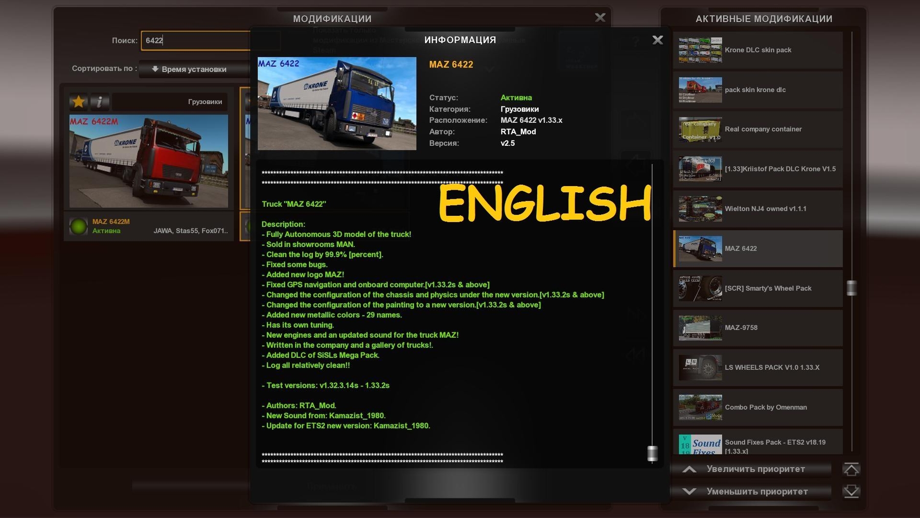 Truck “MAZ 6422” Description: – Fully Autonomous 3D model of the truck! – Sold in showrooms MAN. – Clean the log by 99.9% [percent]. – Fixed some bugs. – Added new logo MAZ! – Fixed GPS navigation and onboard computer.[v1.33.2s & above] – Changed the configuration of the chassis and physics under the new version.[v1.33.2s & above] – Changed the configuration of the painting to a new version.[v1.33.2s & above] – Added new metallic colors – 29 names. – Has its own tuning. – New engines and an updated sound for the truck MAZ! – Written in the company and a gallery of trucks!. – Added DLC of SiSLs Mega Pack. – Log all relatively clean!! – Test versions: v1.32.3.14s – 1.33.2s – Authors: RTA_Mod. – New Sound from: Kamazist_1980. – Update for ETS2 new version: Kamazist_1980. Truck “MAZ 6422М” – Fully Autonomous 3D model of the truck! – Fixed collision of truck (depends on the trailer and could not under it to call)Phantom94.on – Full support for “DLC Cabin Accessories” and “National Window Flags”! My changes [Kamazist_1980]: – Replaced all sound. – Ordered a new camera. – Re-written in the company and gallery of trucks!. – Added new logo MAZ! – Fixed GPS navigation and onboard computer.[v1.33.2s & above] – Changed the configuration of the chassis and physics under the new version.[v1.33.2s & above] – Changed the configuration of the painting to a new version.[v1.33.2s & above] – Added new metallic colors – 29 names. Test version: 1.32.xx – 1.33.2s. Authors: JAWA, Stas55, Fox071rus. Adaptation for v1.33 and residence orders: – Kamazist_1980. Change sound,camera and colors: – Kamazist_1980. Credits: MAZ 6422 – Authors: RTA_Mod; MAZ-64 |